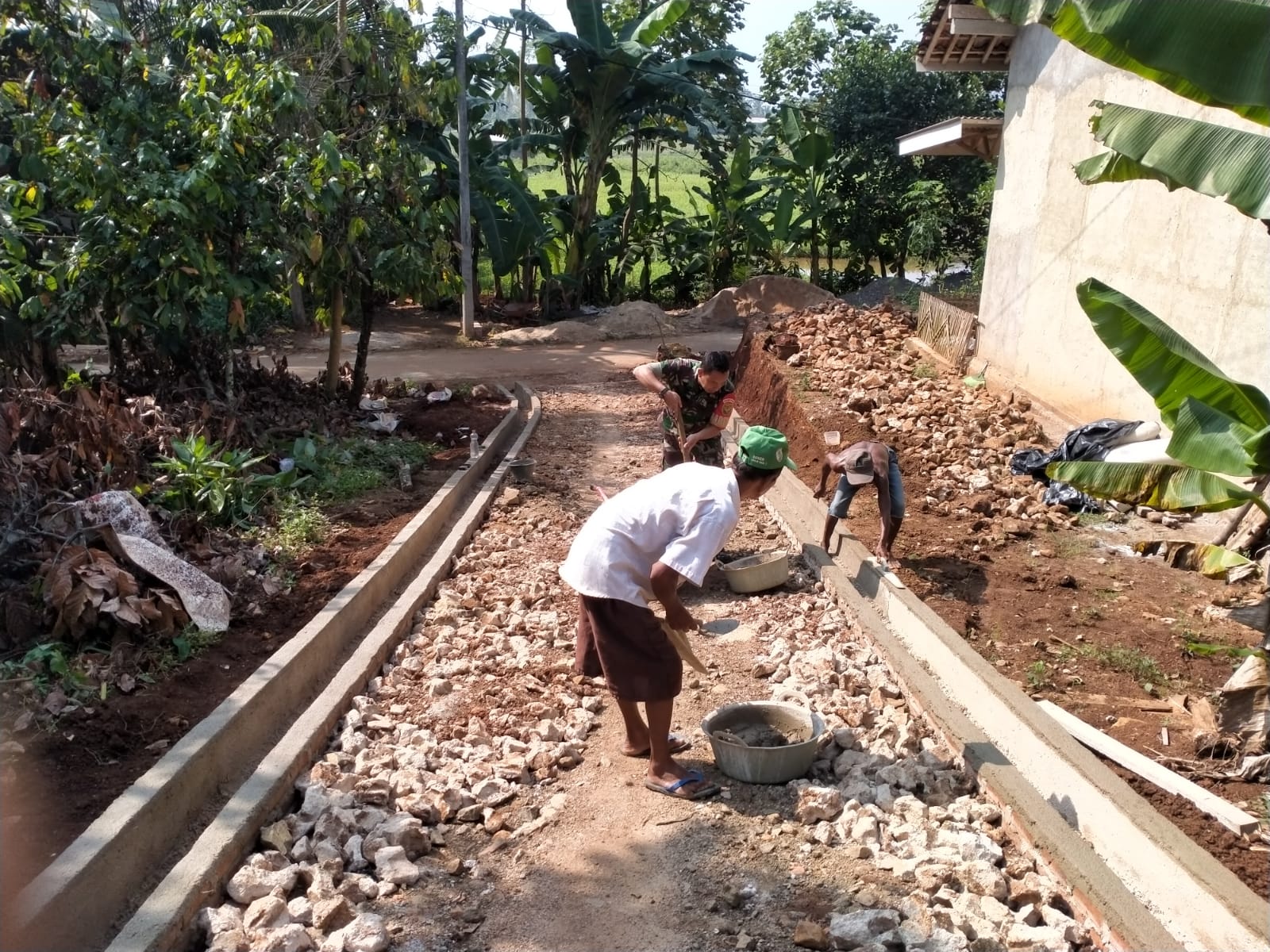 Babinsa Koramil 424-10/Pardasuka Serda Saifudin melaksanakan gotong-royong pembangunan jalan di Pekon Wargomulyo, Kec. Pardasuka, Kab. Pringsewu, Rabu (26-06-2024).