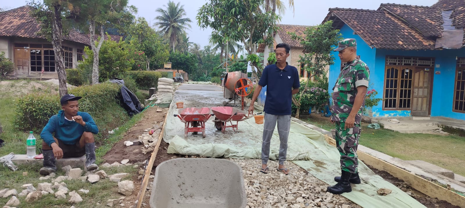 Babinsa koramil 424-09/Sukoharjo Serka Misno melaksanakan gotong royong membantu pengecoran jalan di Pekon Keputran, Kec. Sukoharjo, Kab. Pringsewu, Minggu (13/07/2025).