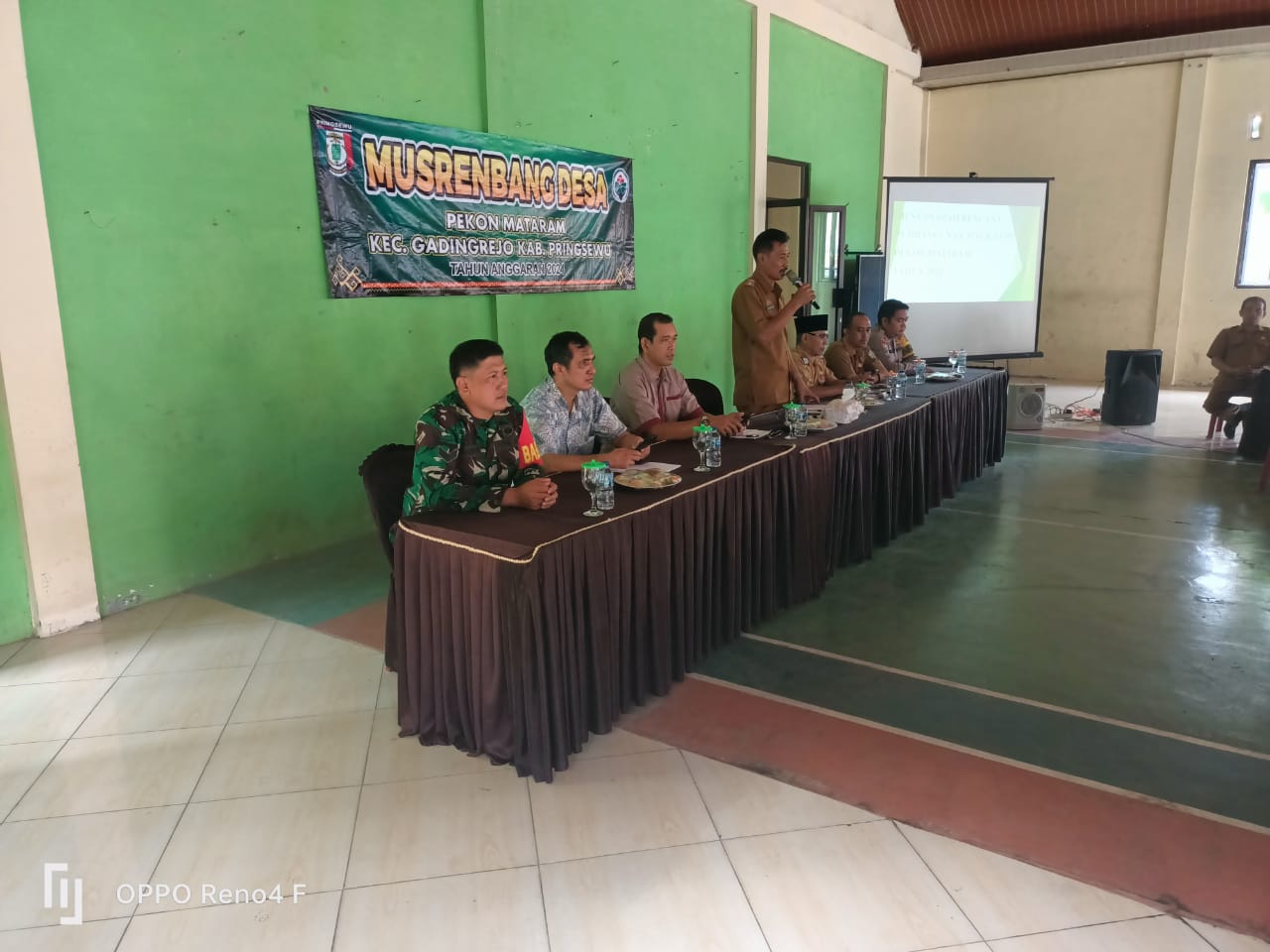 Mendukung pembangunan di wilayah binaan, Babinsa Koramil 424-07/Gadingrejo Sertu Rohmanudin menghadiri Musrenbangdes tahun 2024, kegiatan di Balai Pekon Mataram, Kec. Gadingrejo, Kab. Pringsewu, Selasa(14/11/2023).
