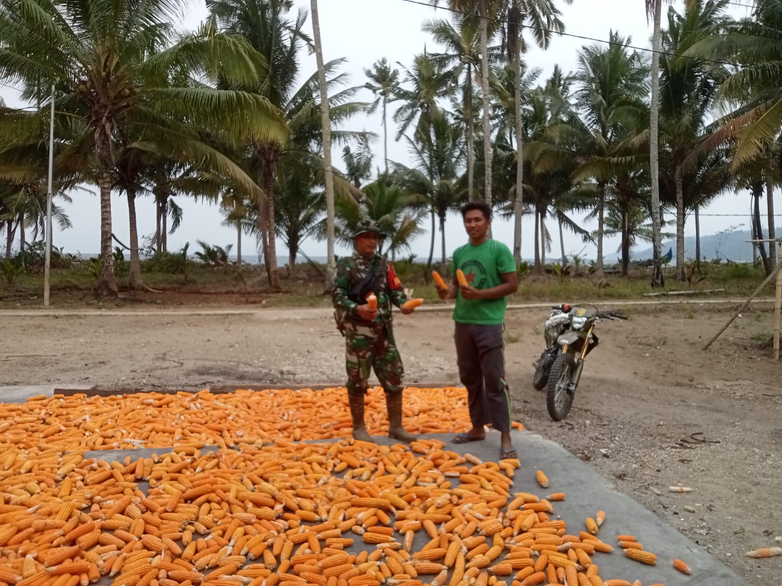 Babinsa Koramil 424-03/Kota Agung Sertu Hamzah melaksanakan kegiatan pendampingan membantu petani menjemur Jagung milik Bapak Subadri di Pekon Tirom Kec. Pematangsawah, Kab. Tanggamus, Selasa (21/11/2023).