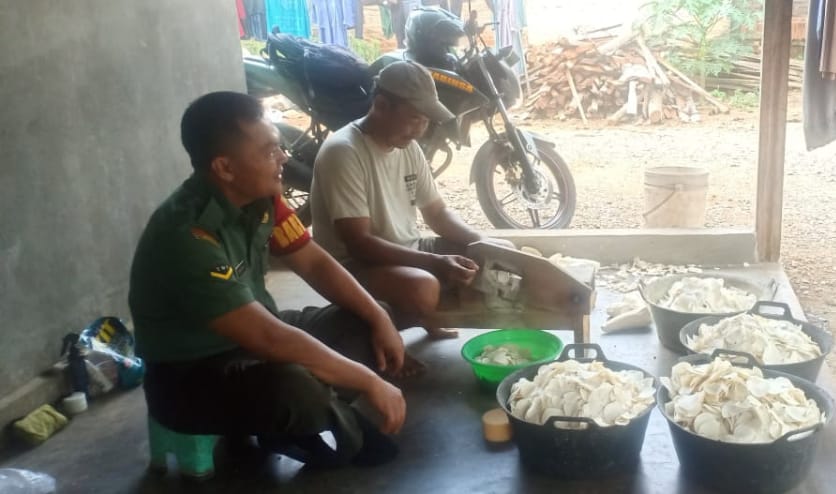 Babinsa Koramil 424-09/Sukoharjo Serda Subastian melaksanakan pendampingan pengusaha kecil menengah pengrajin tradisional pembuatan keripik singkong milik Bapak Suardi bertempat di Pekon Tritunggal Mulya, Kec. Adiluwih, Kab. Pringsewu, Rabu (24/04/2024).