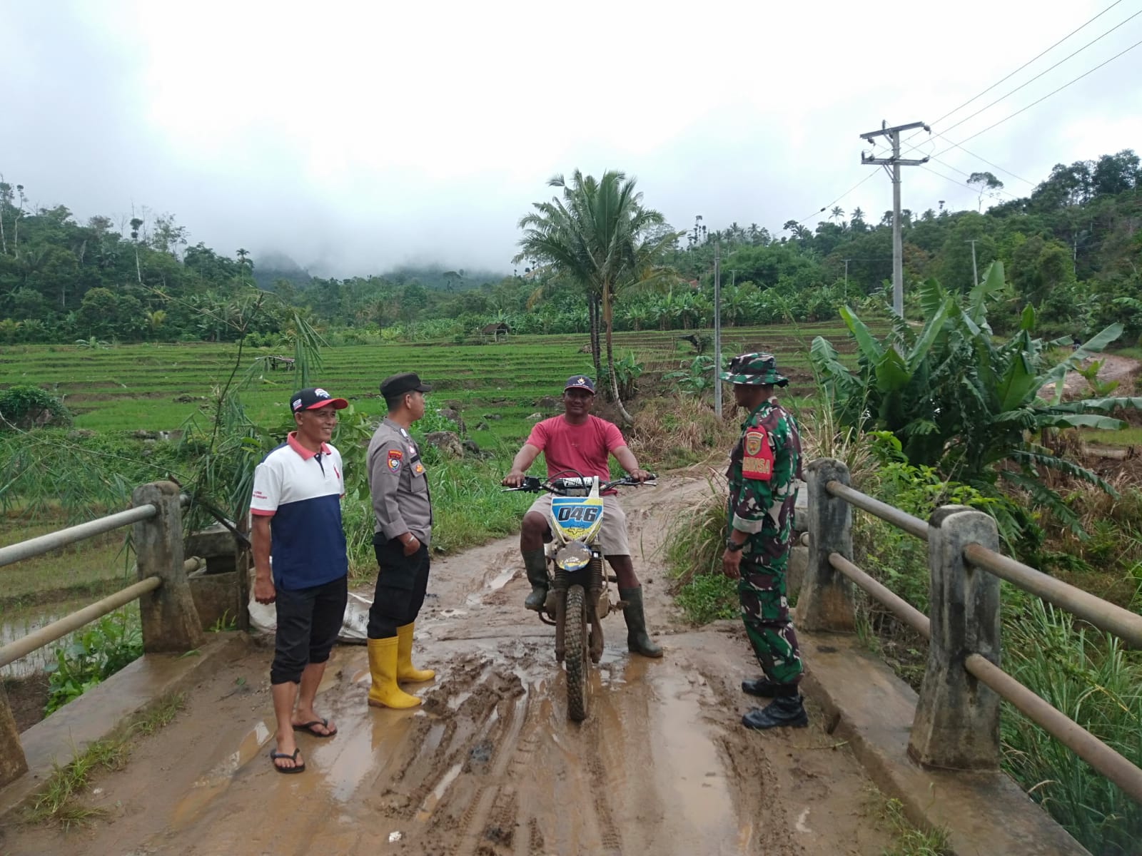 Babinsa Koramil 424-08/Pulau Panggung Koptu Isnaini Andhi bersama Babinkamtibmas Polsek Pulau Panggung mendapatkan informasi Jembatan longsor langsung melakukan pengecekan lokasi kejadian longsor di Pekon Rejosari Kec. Ulu belu, Kab. Tanggamus, Sabtu (13/01/2024).