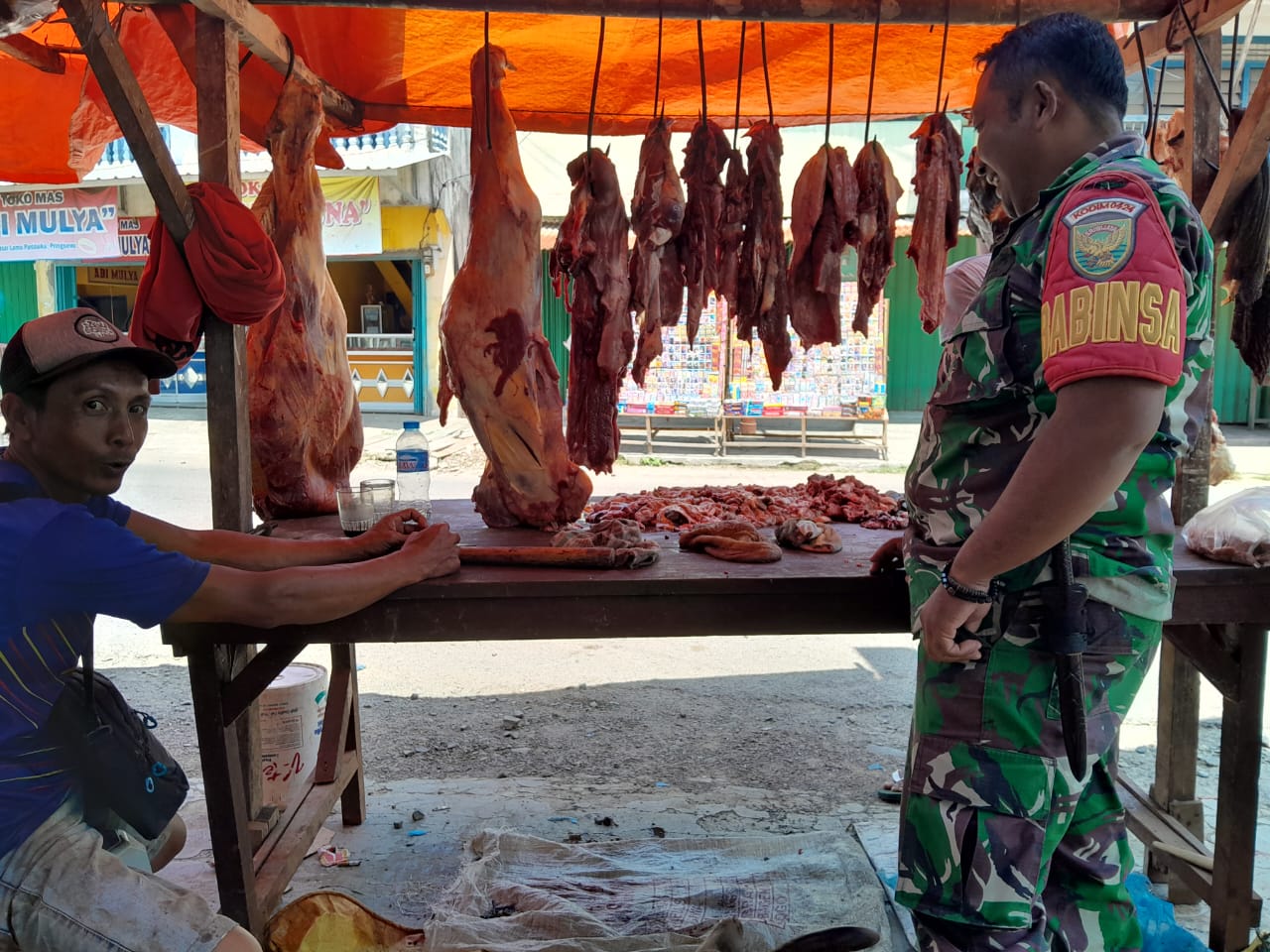 Menjaga Stabilitas pangan Babinsa Koramil 424-10/Pardasuka Sertu Martoyo melaksanakan kegiatan Komsos Mengecek Harga sembako, Daging Sapi dan Harga Daging Ayam di Pasar Pardasuka, Kec, Pardasuka, Kab. Tanggamus, Selasa (26/03/2024).