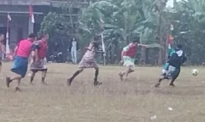 Jelang Hut RI Ke-78, Danramil 0424/Talangpadang Beserta anggota koramil mengikuti Pertandingan Sepak Bola Pakai Daster dilapangan bolakaki Pekon Ciherang Kec. Gunung Alip Kab. Tanggamus. Selasa (08/08/2023).