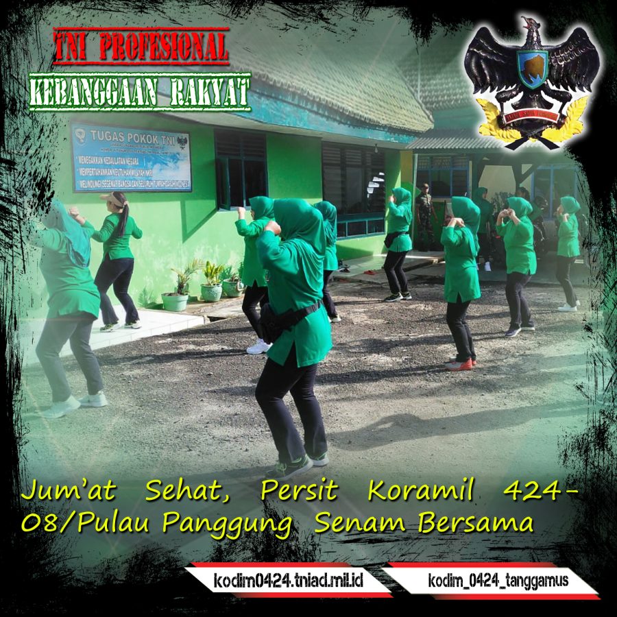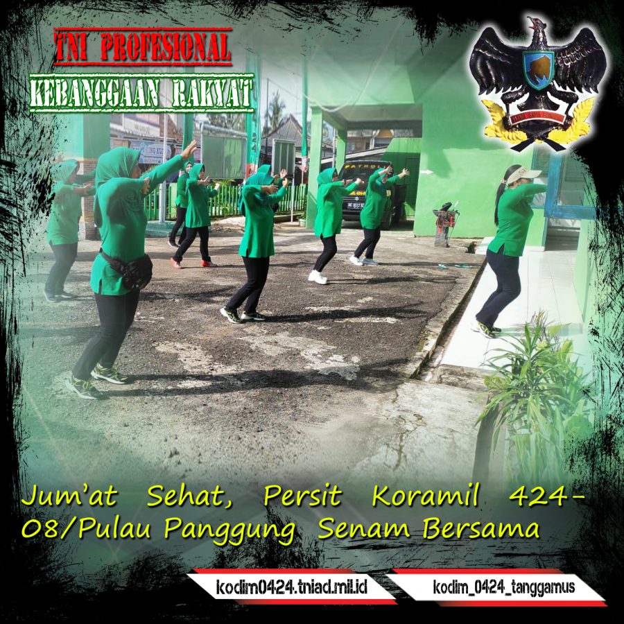Tanggamus – Persatuan Istri Tentara (Persit) Kartika Chandra Kirana (KCK) Ranting 09 Koramil 424-08/Pulau Panggung Cabang XLVI Dim 0424/Tanggamus melakukan kegiatan Jumat Sehat dengan senam bersama di halaman Makoramil 424-08/ Pulau Panggung Jumat (18/3/22) pagi.