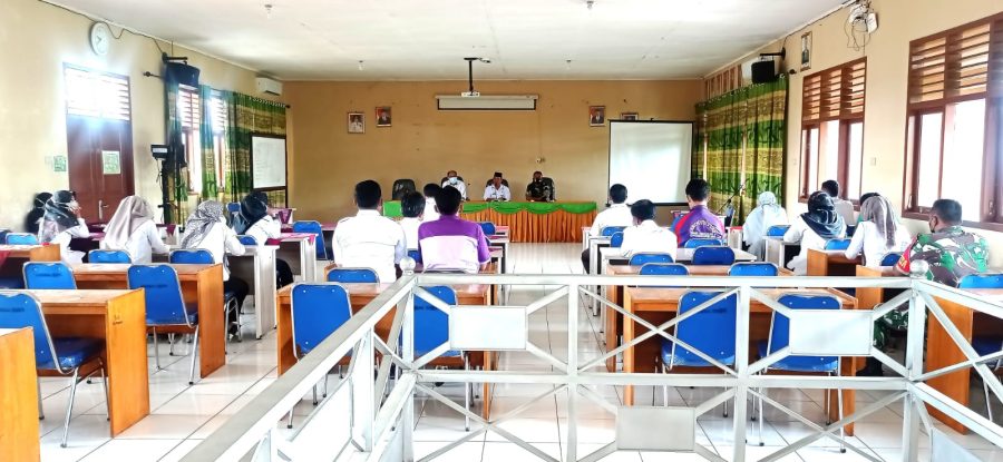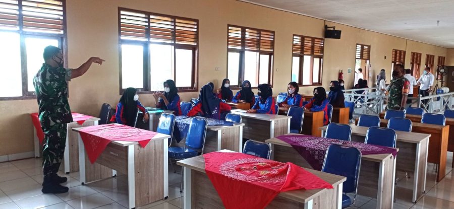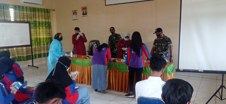 Kapten Inf Redi Kurniawan Danramil 424-07/Gdr bersama 3 orang anggota tampak tampak mendampingi petugas dr UPT Puskesmas Wates Kec Gadingrejo sedang melaksanakan kegiatan tracing Guru dan Siswa SMK Negeri 1 Gadingrejo oleh UPT Puskesmas Wates bertempat di aula SMKN 1 Gadingrejo.