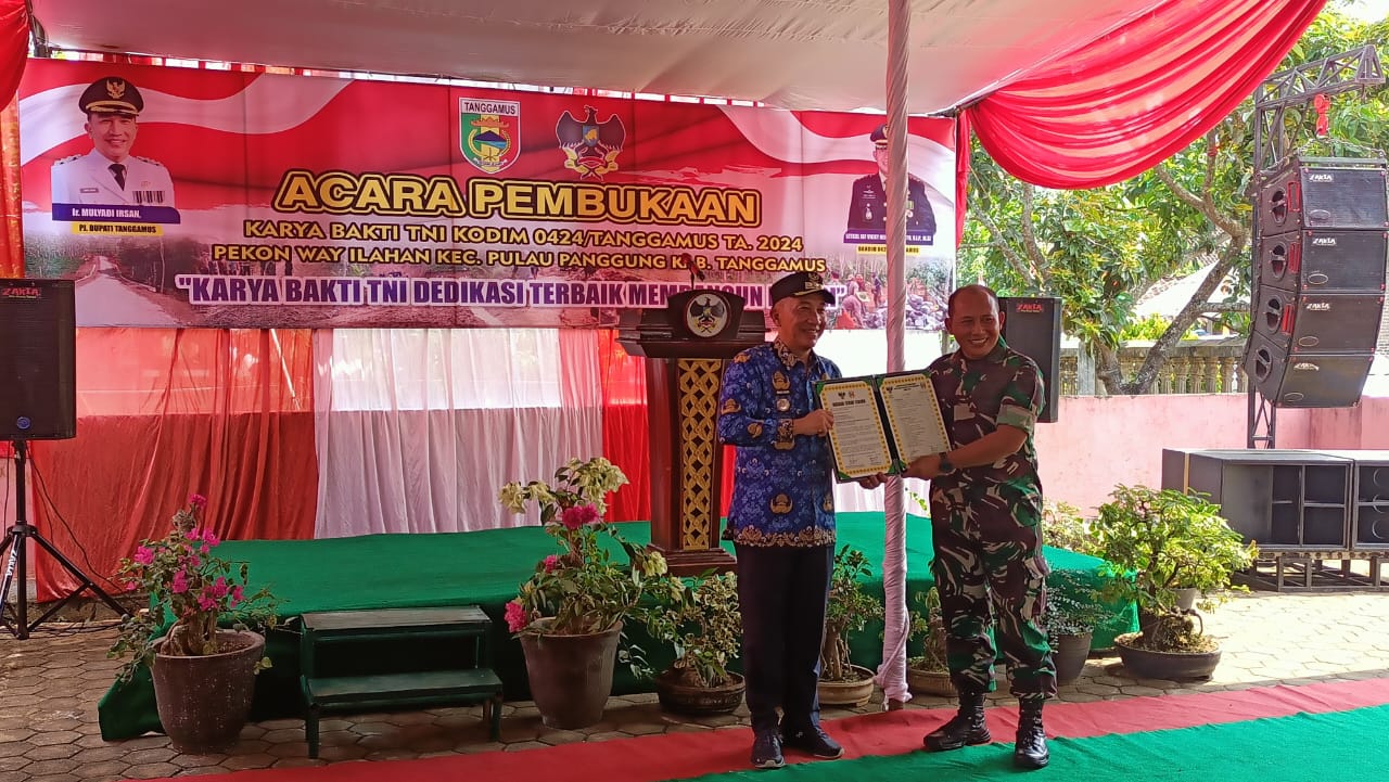 Karya Bakti TNI Tahun 2024, Kodim 0424/Tanggamus, Resmi di Buka Pj Bupati Tanggamus Bapak Ir. Mulyadi Irsan di Dampingi Dandim 0424/Tanggamus Letkol Inf Vicky Heru Harsanto. S.I.P., M.si., di Pekon Way Ilahan Kec. Pulau Panggung Kab. Tanggamus dengan tema ” Karya Bakti TNI Dedikasi Terbaik Membangun Negeri” Senin (20/05/2024).
