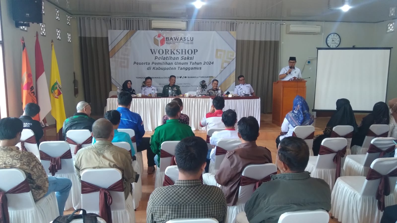 Ketua Bawaslu Kab. Tanggamus Najih Mustofa, S.H.I.,M.Pd. menyampaikan Workshop pelatihan ini dilakukan sebagai upaya memberikan pemahaman dan meningkatkan pengetahuan serta keterampilan yang baik sesuai regulasi kepada para saksi, kegiatan ini sangat penting dikarenakan nanti para saksi akan mengetahui apa saja yang boleh di lakukan dan yang tidak boleh dilakukan pada hari H pencoblosan Tanggal 14 Februari 2024.