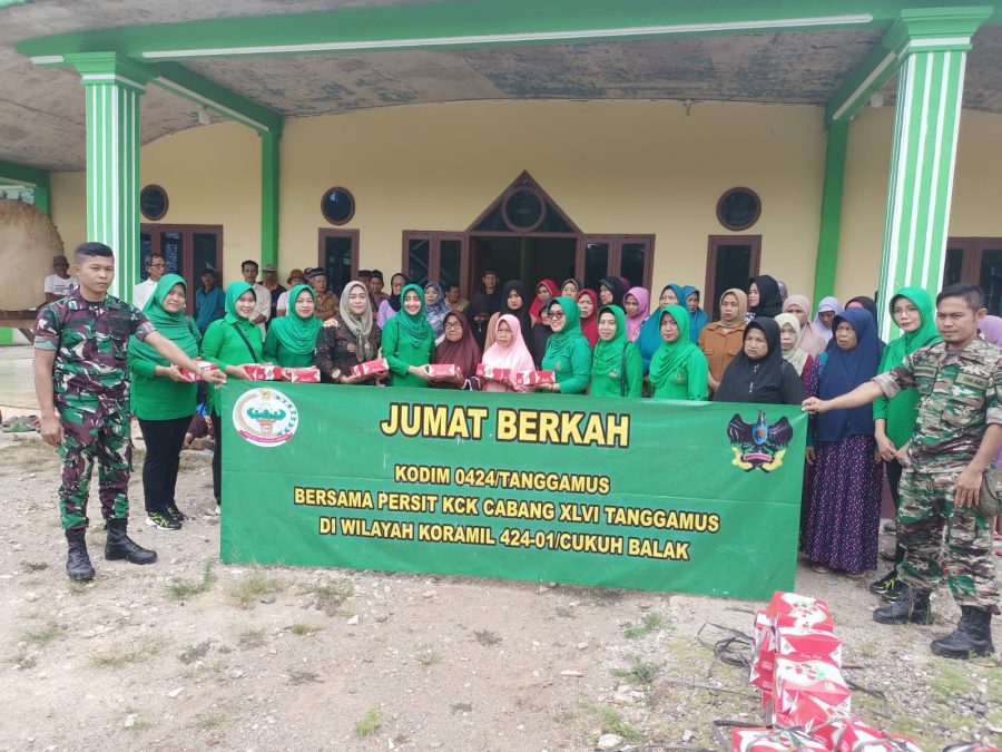 Ketua Persit KCK Cabang XLVI Kodim 0424/Tanggamus Ny. Vicky Heru Harsanto melaksanakan kegiatan Kunjungan di Koramil 424-01/Ckb dalam rangka Jum’at Berkah bertempat di Masjid Arahman Pekon Ampai Kec. Limau Kab. Tanggamus, Jumat (17-02-2023).