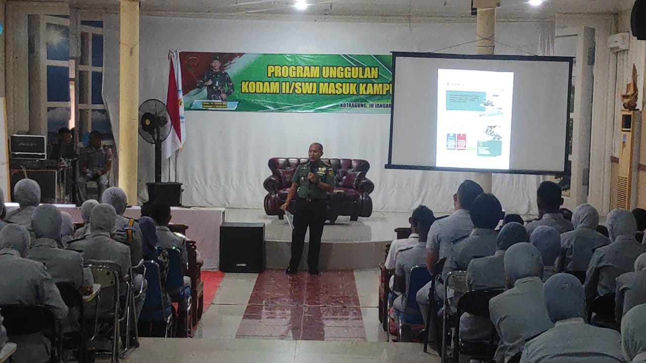 Sebagai wujud nyata dukungan berjalannya program Kodam II/Sriwijaya Masuk Kampus, Komandan Kodim 0424/Tanggamus Letkol Inf Vicky Heru Harsanto S.I.P.,M.Si., memberikan kuliah umum kepada para mahasiswa Universitas Politeknik Ahli Usaha Perikanan (AUP), bertempat di Gedung Carvio Kampus Politeknik Ahli Usaha Perikanan Pekon Way Gelang, Kecamatan Kota Agung Barat , Kabupaten Tanggamus, Kamis (18/01/2024).