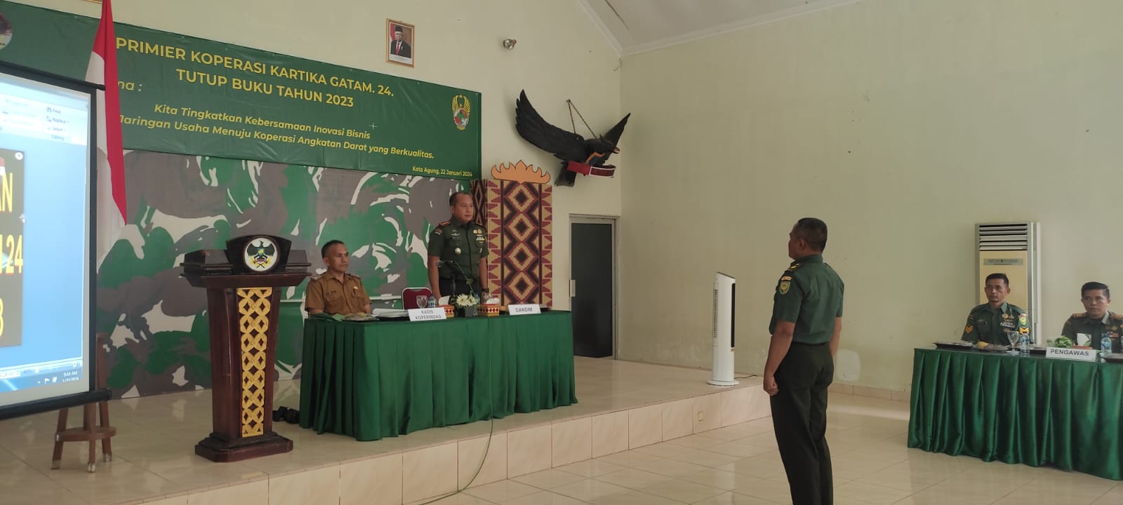 Dandim 0424/Tanggamus Letkol Inf Vicky Heru Harsanto.S.I.P., M.Si. membuka Rapat Anggota Tahunan (RAT) Koperasi Kartika Gatam 24 dengan tema ” Meningkatkan Kebersamaan Inovasi Bisnis Solidaritas Jaringan Usaha Menuju Koperasi Angkatan Darat Yang Berkualitas” bertempat di Aula Jenderal Sudirman Makodim 0424/Tanggamus, Jln Raya Waysom Kec. Kotaagung Kab. Tanggamus Senin (22/01/2024).