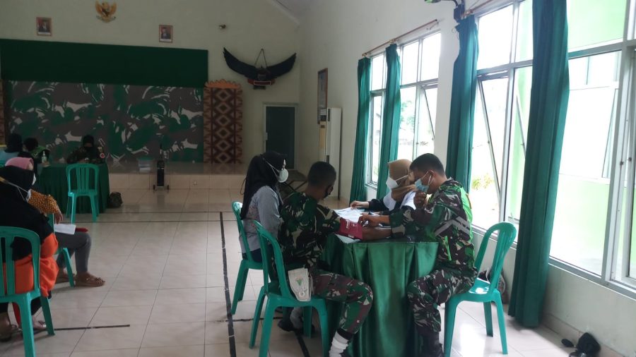 Kodim 0424/Tanggamus menggelar Vaksinasi Covid-19 Dosis ketiga atau vaksin Booster (penguat) kepada Prajurit, PNS dan Anggota Persit, Warga, bertempat di Aula Makodim, Jalan Ir. H Juanda Waysom, Kecamatan Kotaagung, Jumat(26/02).