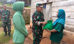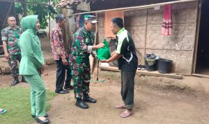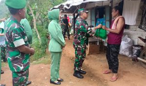 Dandim 0424/Tanggamus Letkol Inf Vicky Heru Harsanto S.I.P.,M.Si,. dan ibu-ibu Persit membagikan Pembagian paket sembako dilakukan secara door to door, Pekon Bumi Arum Kec.Pringsewu. Jum’at (23/06/2023).