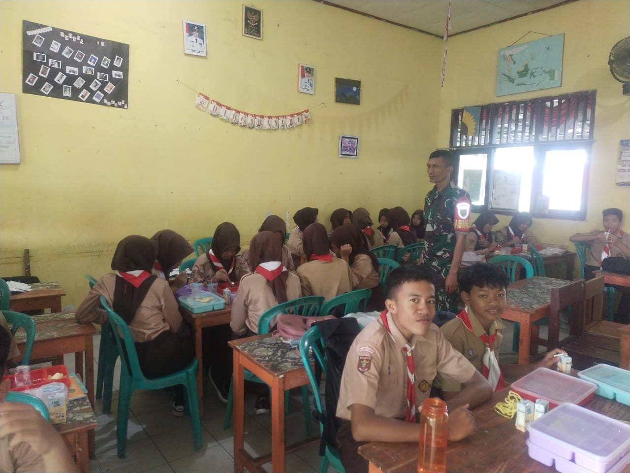Selain mendampingi distribusi makanan, Babinsa juga memberikan edukasi tentang pola makan sehat dan pentingnya hidup bersih kepada para siswa-siswi.