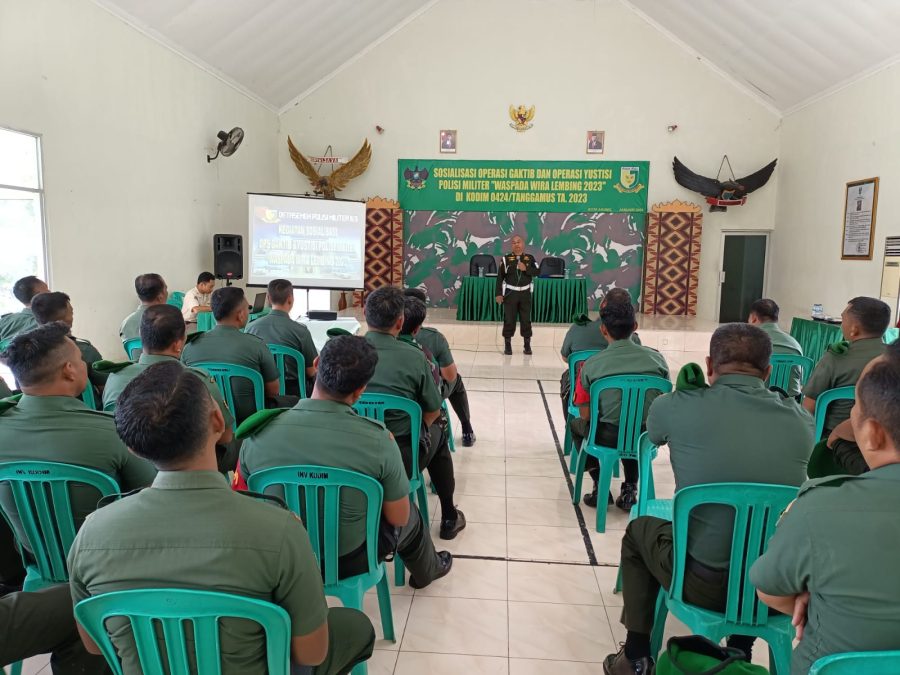 Kodim 0424/Tanggamus menerima Sosialisasi Operasi Gaktib dan Operasi Yustisi Polisi Militer TA. 2023 dari Denpom II/3 Lampung dengan tema, “Waspada Wira Lembing 2023”, di ikuti seluruh Prajurit dan PNS Kodim 0424/Tanggamus bertempat di aula Jendral Sudirman Makodim 0424/Tanggamus, Kamis,(19-01-2023).