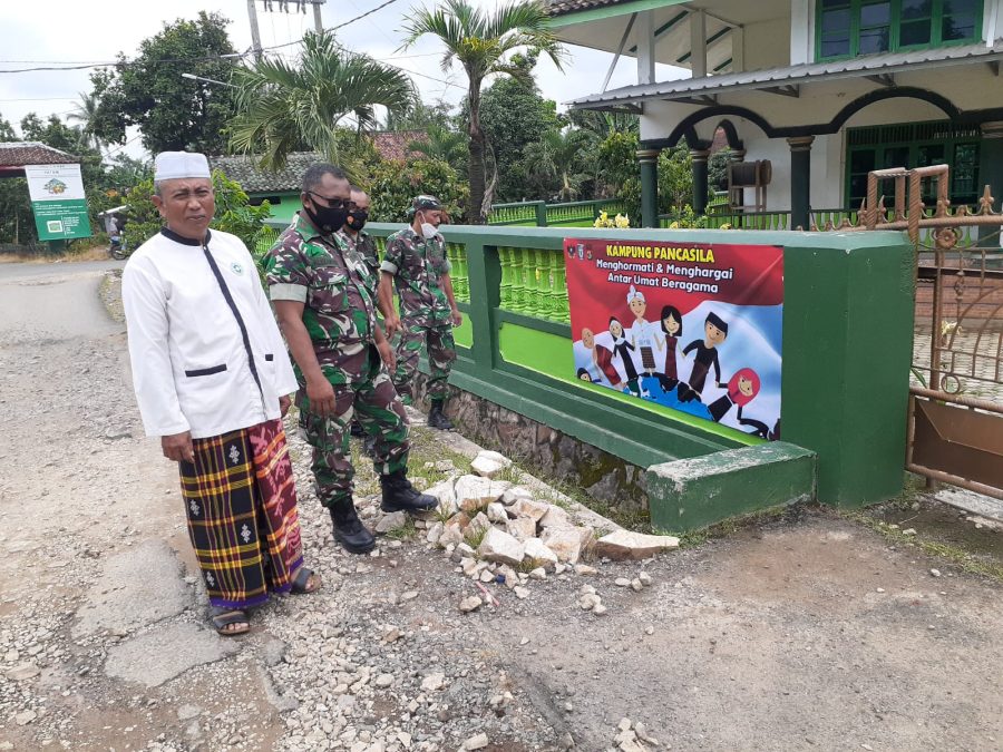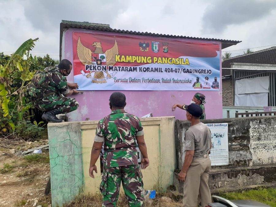 kodim0424.tni-ad.mil.id – Upaya menguatkan Idiologi pancasila di wilayah, Serda Alek, anggota Babinsa Koramil 424-07/Gadingrejo melakukan gotong royong memasang banner Kampung Pancasila di Pekon Mataram. Minggu (6/3).