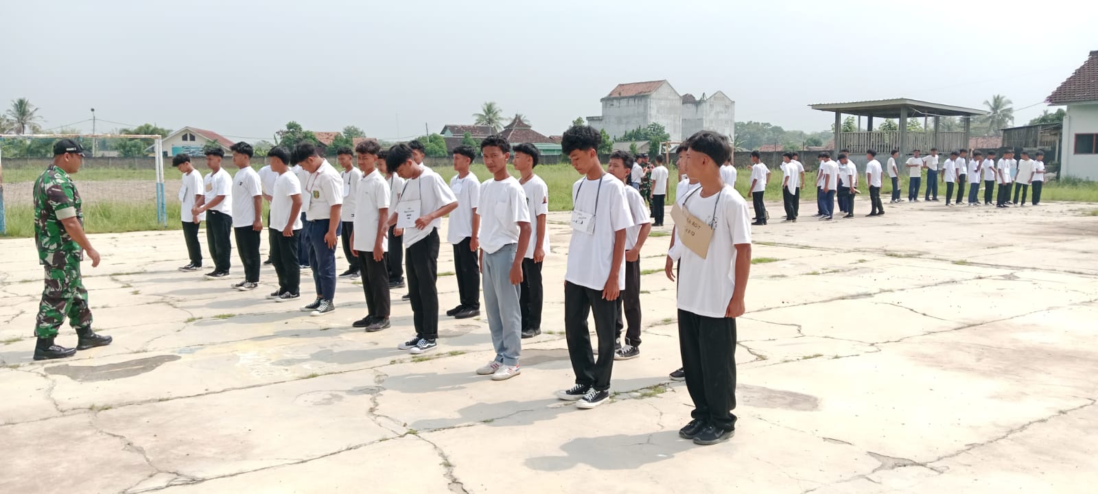 Babinsa Koramil 424-07/Gadingrejo Serka Ahmad Jainudin, bersama dua rekan Babinsa melaksanakan latihan peraturan baris berbaris (PBB) untuk siswa-siswi peserta Masa Pengenalan Lingkungan Sekolah (MPLS) di SMK Yapema Gadingrejo, Selasa (15/07/2025).