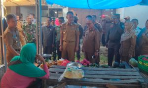 Pabung 0424/Tanggamus Mayor Cpl Sarwan Iranu dan Forkopimda Tinjau Pasar, Cek Stok dan Harga Pangan di pasar Sukoharjo Kecamatan Sukoharjo Kabupaten Pringsewu. Selasa (16/1/24).