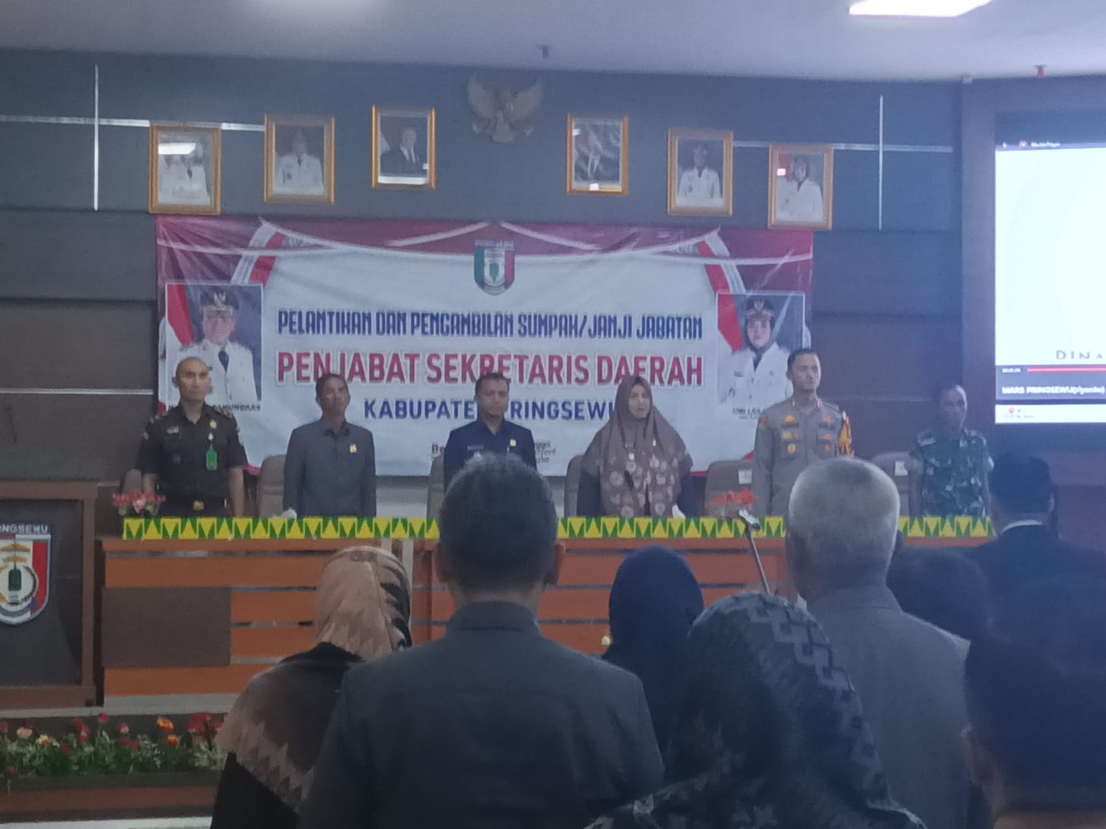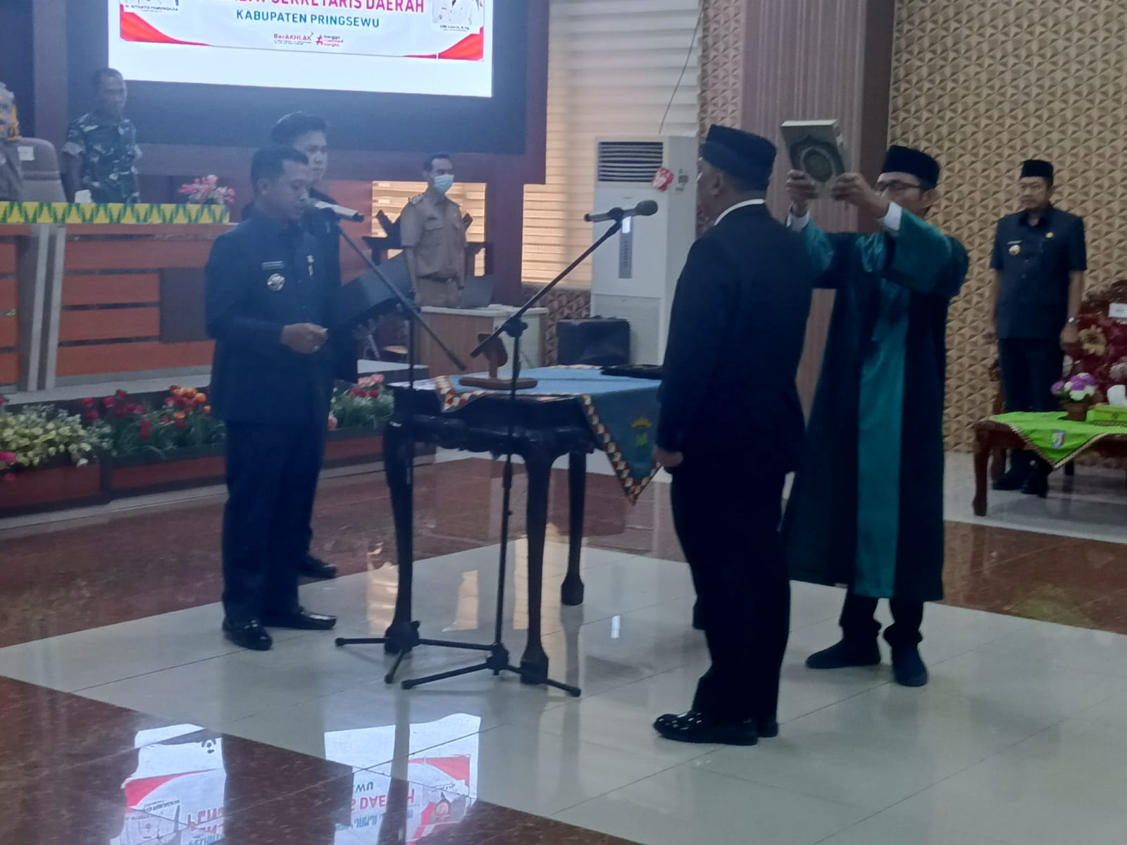 Pabung Kodim 0424/ Tanggamus, Kapten Inf Patrisius Rahmat H, S.Sos menghadiri kegiatan Pelantikan dan pengambilan sumpah/janji jabatan Penjabat Sekretaris Daerah Kabupaten Pringsewu bertempat di Aula Kantor Bupati Kab. Pringsewu. Senin (10/03/2025).