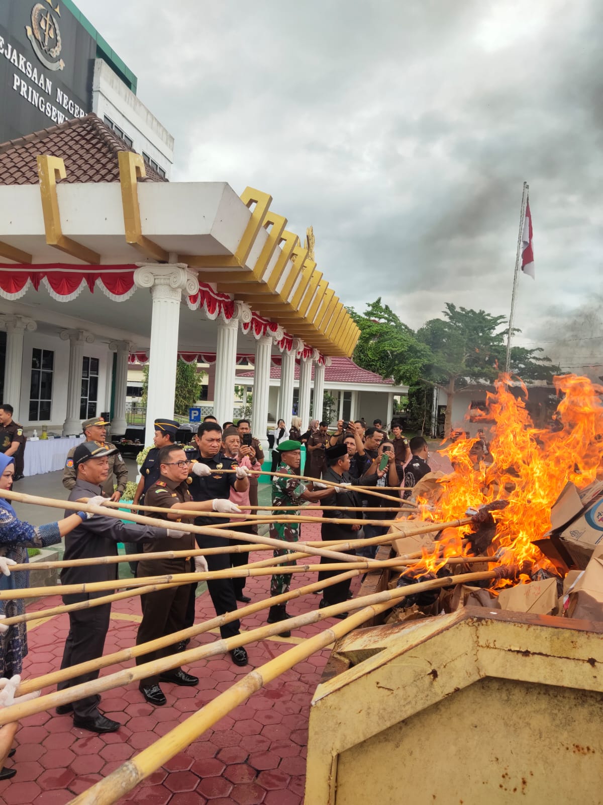 Pabung Pringsewu Kodim 0424/Tanggamus Kapten Inf P Rahmat H.S.Sos., menghadiri Pemusnahan Barang Rampasan Negara Oleh Kejaksaan Negri Pringsewu bertempat di Kantor Kejaksaan Nengri Pringsewu, Senin (03/12/2024).