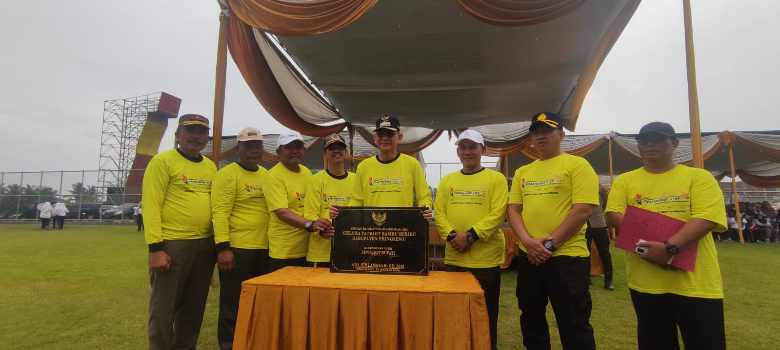 Pabung Kodim 0424/Tanggamus Mayor Cpl Sarwan Iranu menghadiri kegiatan peresmian gelanggang olahraga patriot bambu seribu dan pembukaan pekan olah raga pelajar ( PORKAB ) kabupaten Pringsewu tahun 2024, bertempat di Jln. kejaksaan kelurahan Pringsewu Barat kecamatan Pringsewu, Kab. Pringsewu, Selasa (30/01/2024).