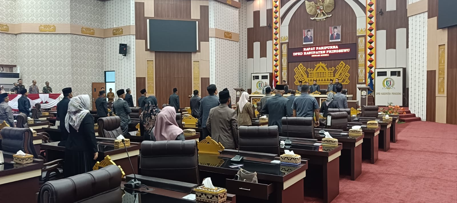 Dalam Sambutannya Bupati Pringsewu H. Riyanto Pamungkas menyampaikan Atas nama Pemerintah Kabupaten Pringsewu, kami menyampaikan penghargaan yang setinggi-tingginya atas usaha dan kerja keras saudara-saudara semua, baik pimpinan, anggota beserta seluruh alat kelengkapan Dewan yang terhormat serta semua pihak baik eksekutif maupun legislatif, sehingga kita dapat melaksanakan rapat paripurna pada hari ini.
