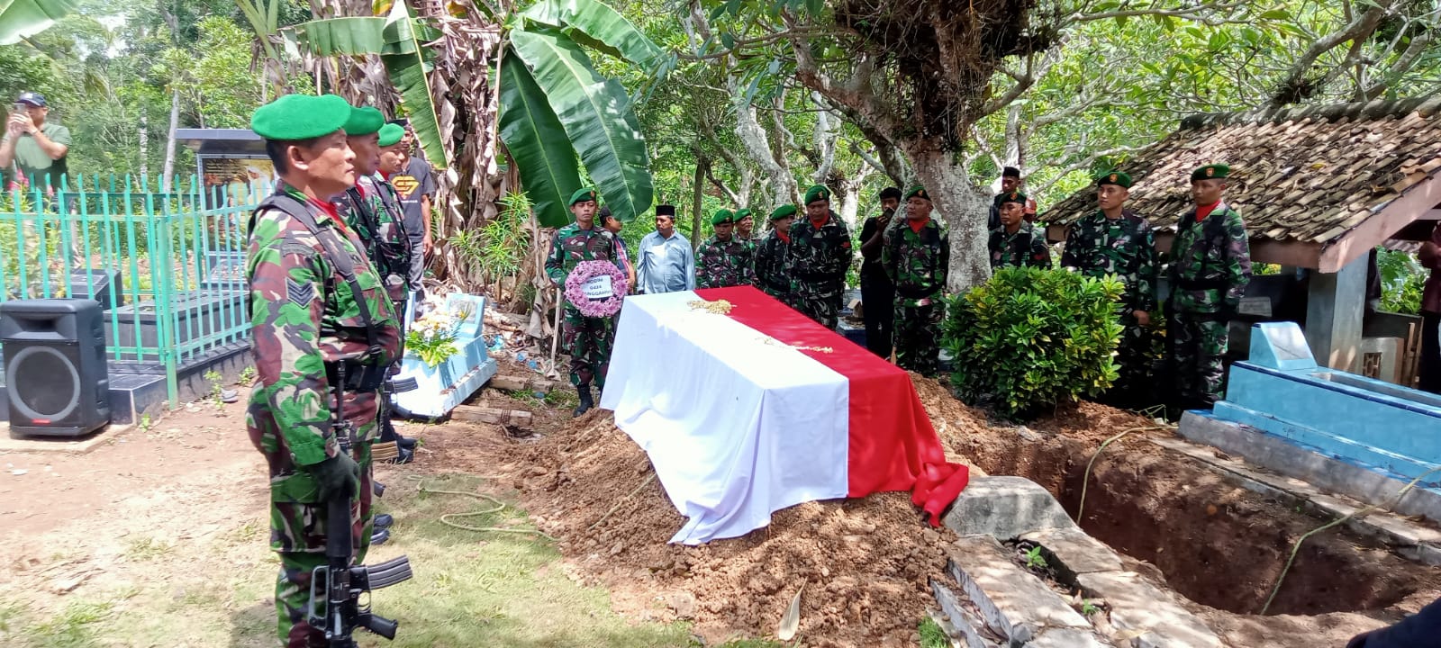 Pabung Kodim 0424/Tanggamus Mayor CPl Sarwan Iranu memimpin upacara pemakaman militer purnawirawan TNI AD almarhum Kopka Purnawirawan Sudi Suhartono yang meninggal dunia karena sakit dan di makamkan secara militer di TPU Pekon Panutan, Kecamatan Pagelaran Kabupaten Pringsewu, Selasa (09/01/ 2024).
