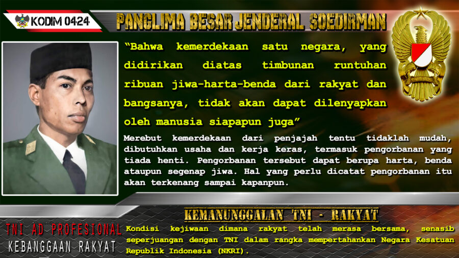Panglima Besar Jenderal Soedirman “Bahwa kemerdekaan satu negara, yang didirikan diatas timbunan runtuhan ribuan jiwa-harta-benda dari rakyat dan bangsanya, tidak akan dapat dilenyapkan olah manusia siapapun juga”redaksiDesember 20, 2021Januari 17, 2022Pesan Panglima Besar Jenderal Soedirman