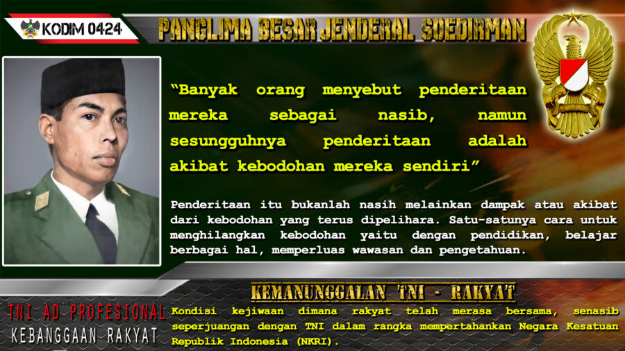 Panglima Besar Jenderal Soedirman “Banyak orang menyebut penderitaan mereka sebagai nasib, namun sesungguhnya penderitaan adalah akibat kebodohan mereka sendiri”redaksiDesember 20, 2021Januari 17, 2022Pesan Panglima Besar Jenderal Soedirman