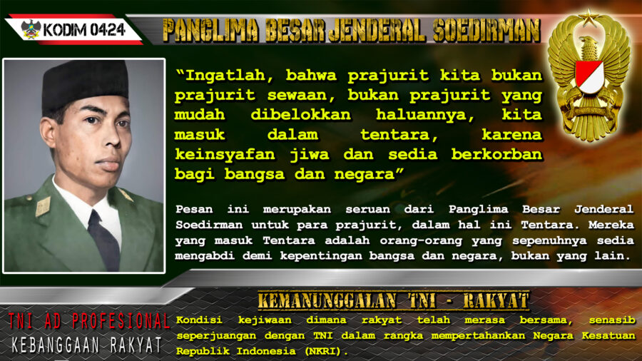 Panglima Besar Jenderal Soedirman “Ingatlah, bahwa prajurit kita bukan prajurit sewaan, bukan prajurit yang mudah dibelokkan haluannya, kita masuk dalam tentara, karena keinsyafan jiwa dan sedia berkorban bagi bangsa dan negara”redaksiDesember 20, 2021Januari 17, 2022Pesan Panglima Besar Jenderal Soedirman