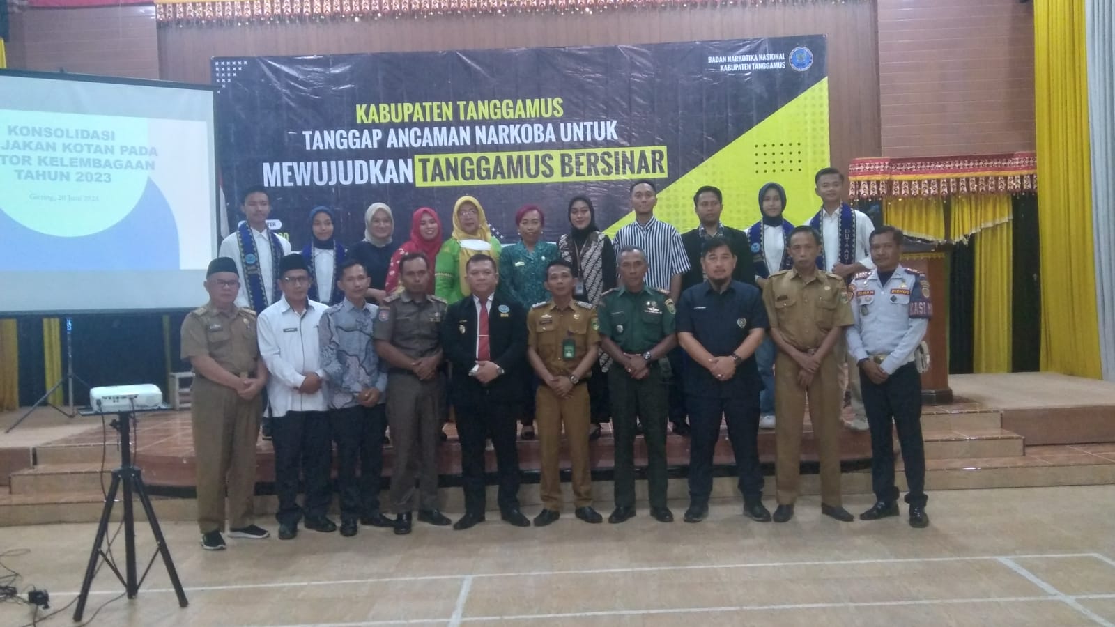 Pasiintel Kodim 0424/Tanggamus Kapten Inf P. Rahmat Hartanto, S.Sos Hadiri Konsolidasi Kebijakan Kota Tanggap Ancaman Narkoba (KOTAN) Sektor Kelembagaan BNN Tanggamus. bertempat di Aula Serumpun Padi, Pekon Kutadalom Kec. Gisting Kab. Tanggamus. Selasa (20/06/2023).