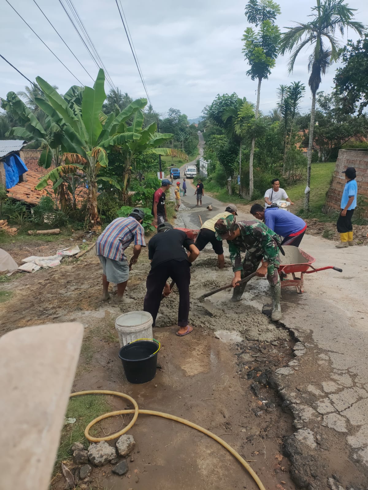 Babinsa Koramil 424-05/Pagelaran Pelda Reno Melaksanakan gotong royong dalam rangka perbaikan jalan Desa bersama warga di Pekon Pagelaran dan panutan Kec. Pagelaran, Kab. Pringsewu, Jum’at (06/12/2024).