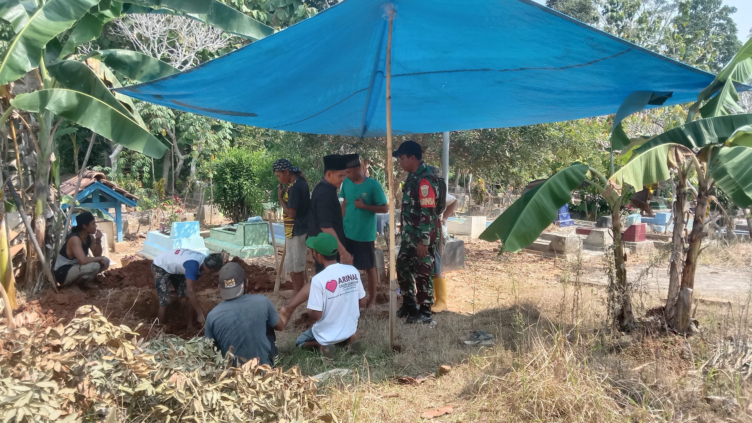 Di Tempat Pemakaman Umum, Babinsa membantu menggali liang kubur bersama masyarakat menyiapkan liang kubur Almarhum dengan semangat gotong royong dan saling bahu membahu menyiapkan liang kubur untuk Almarhum.