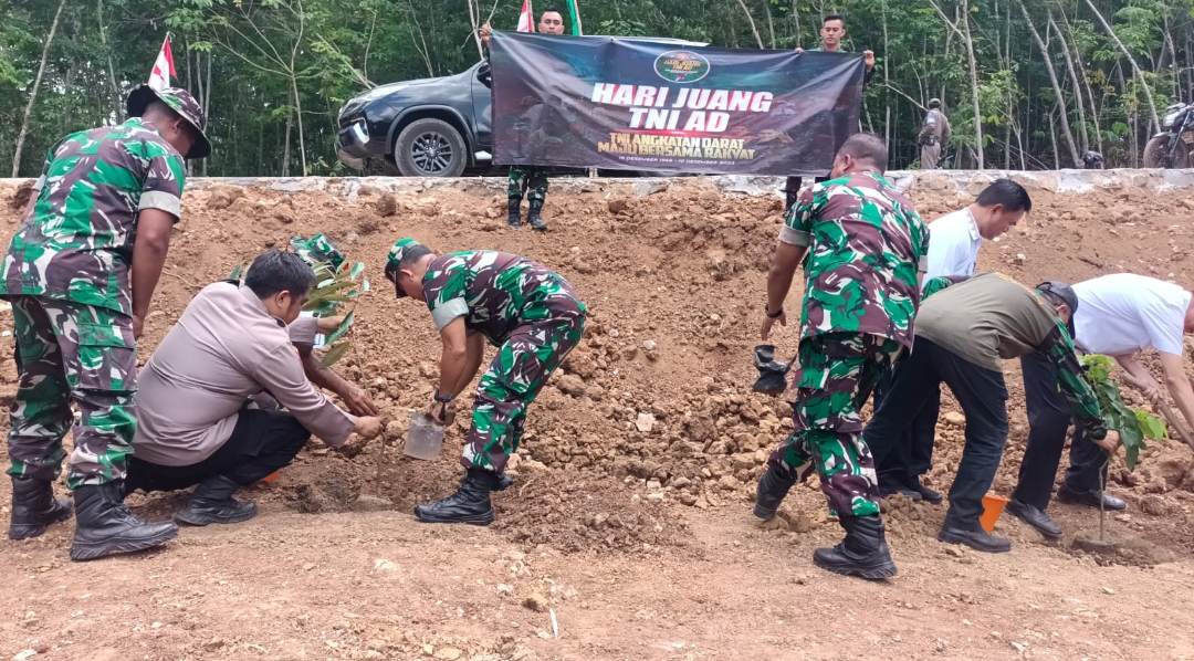 Memperingati Hari Juang TNI AD ke- 78 Dandim 0424/Tanggamus Letkol Inf. Vicky Heru Harsanto, S.I.P, M.Si, bersama PJ Bupati Pringsewu Adi Erlansyah, S.E,M.M dan jajaran Forum Komunikasi Pimpinan Daerah (Forkopimda) melakukan penanaman pohon di Pekon Mataram Kec Gadingrejo Kab Pringsewu, Kamis (14/12/2023).