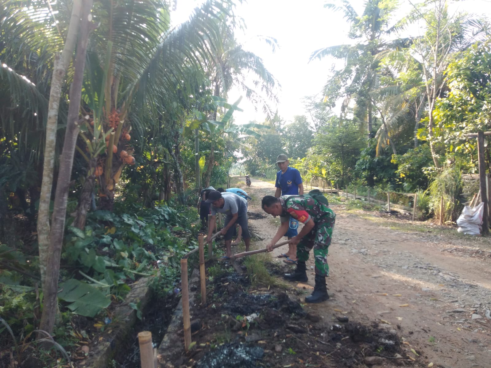 Babinsa Koramil 424-05/Pagelaran Serka Sulistyo bersama warga gotong royong membersihkan aliran air atau parit di Pekon Madaraya, Kec. Pagelaran Utara, Kab. Pringsewu, Minggu (21/04/24).