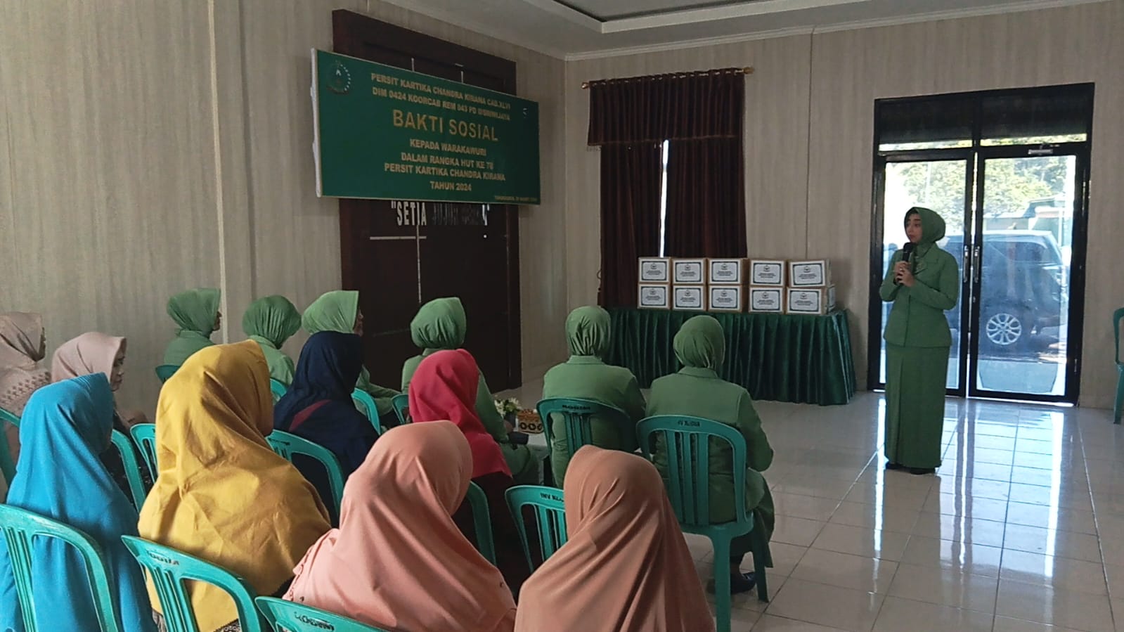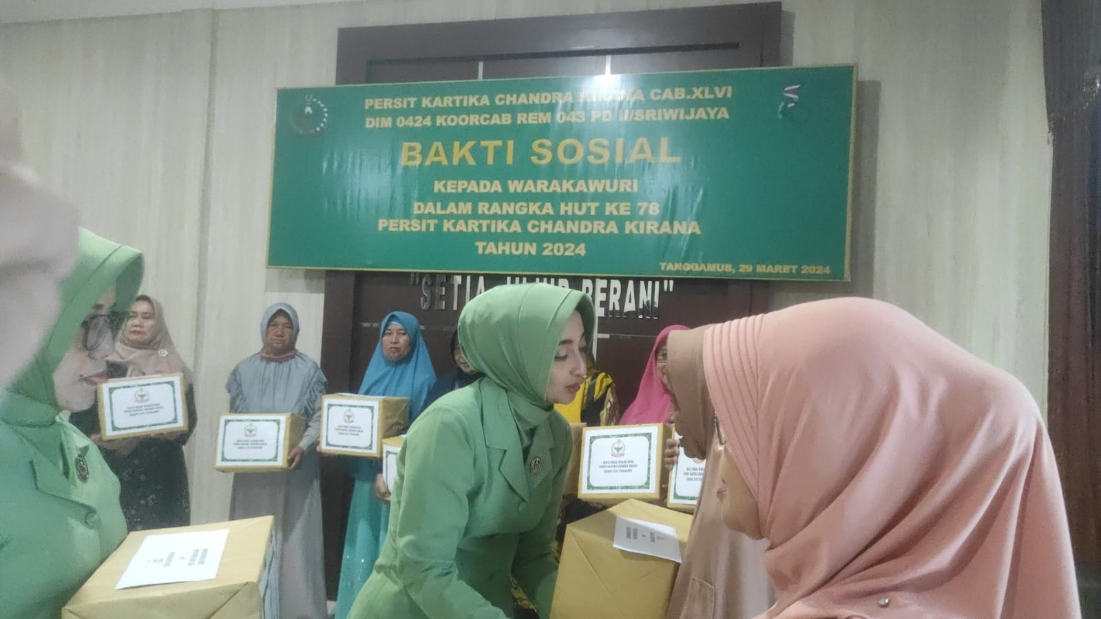 Persit KCK cabang XLVI Kodim 0424/Tanggamus melaksanakan bakti sosial pembagian sembako kepada Warakauri di Gedung Pamungkas. Makodim 0424/Tanggamus Jl Raya Waysom Kec. Kotaagung. Jumat (28/3/24).