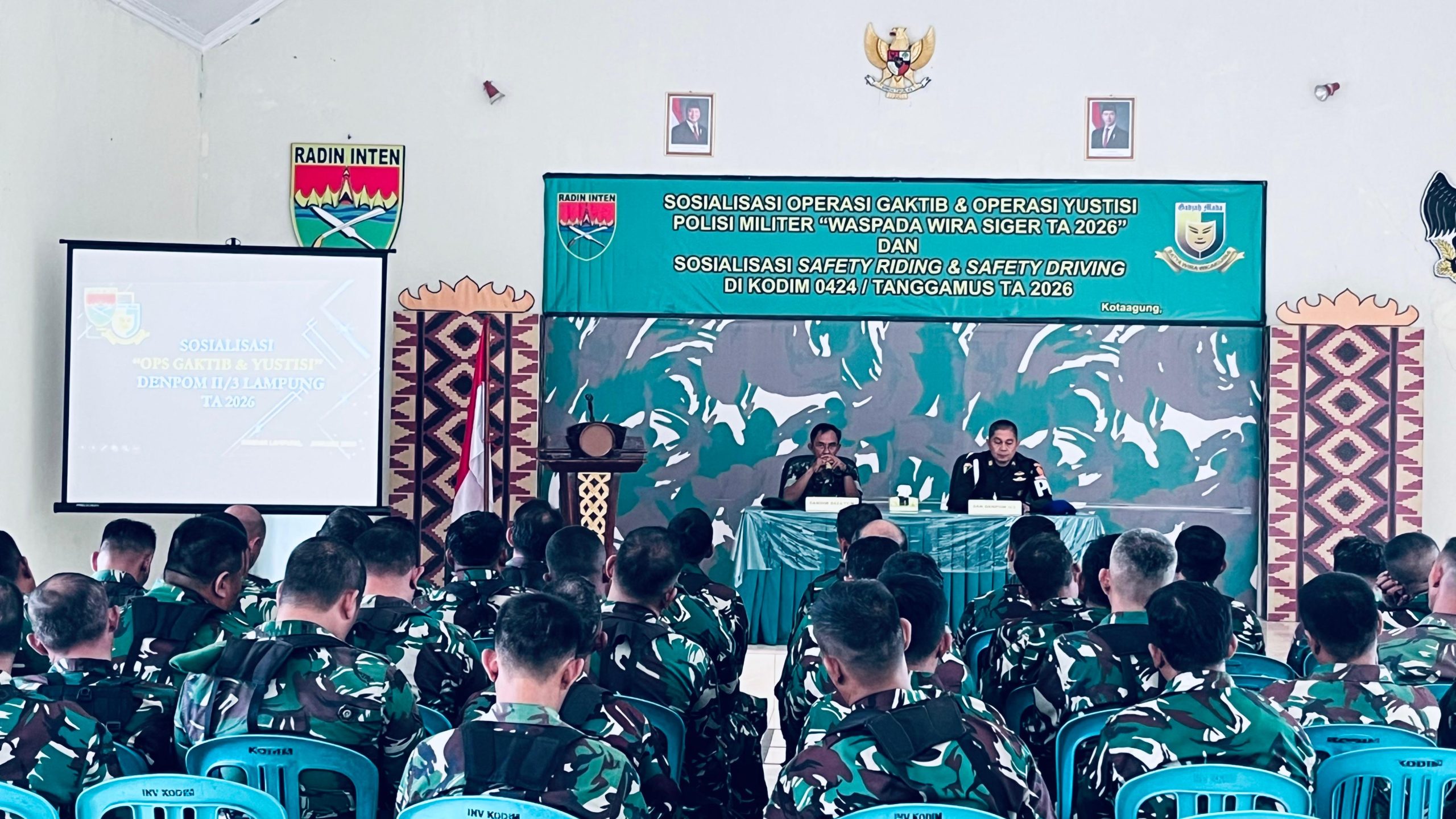 Tanggamus – Personel Kodim 0424/Tanggamus menerima Sosialisasi Operasi Penegakan Ketertiban (Ops Gaktib) dan Yustisi Tahun Anggaran 2026 dari Denpom II/3 Lampung dengan mengusung tema “Waspada Wira Siger”. Kegiatan tersebut berlangsung di Aula Jenderal Sudirman Makodim 0424/Tanggamus, Selasa (03/03/2026).
