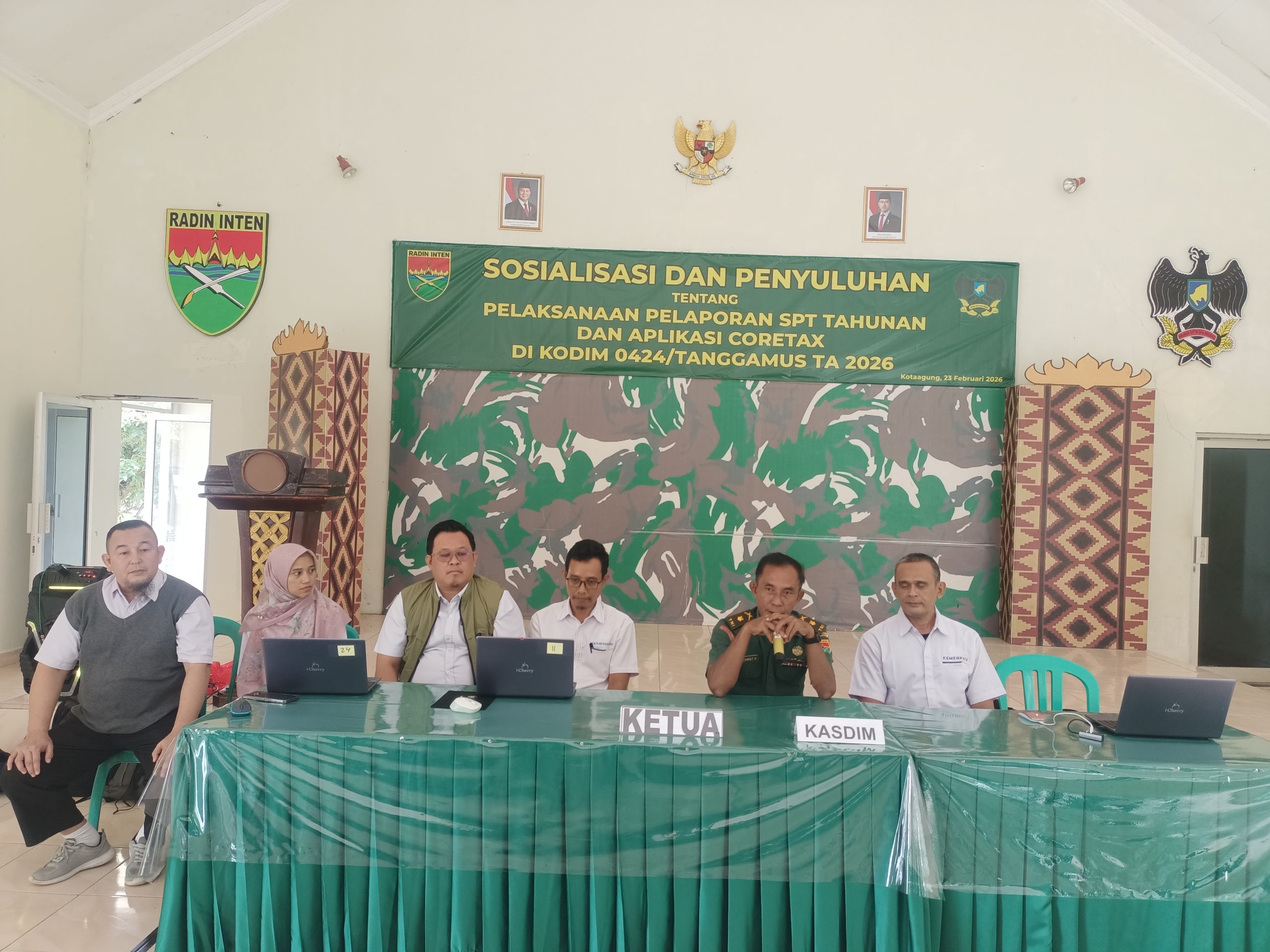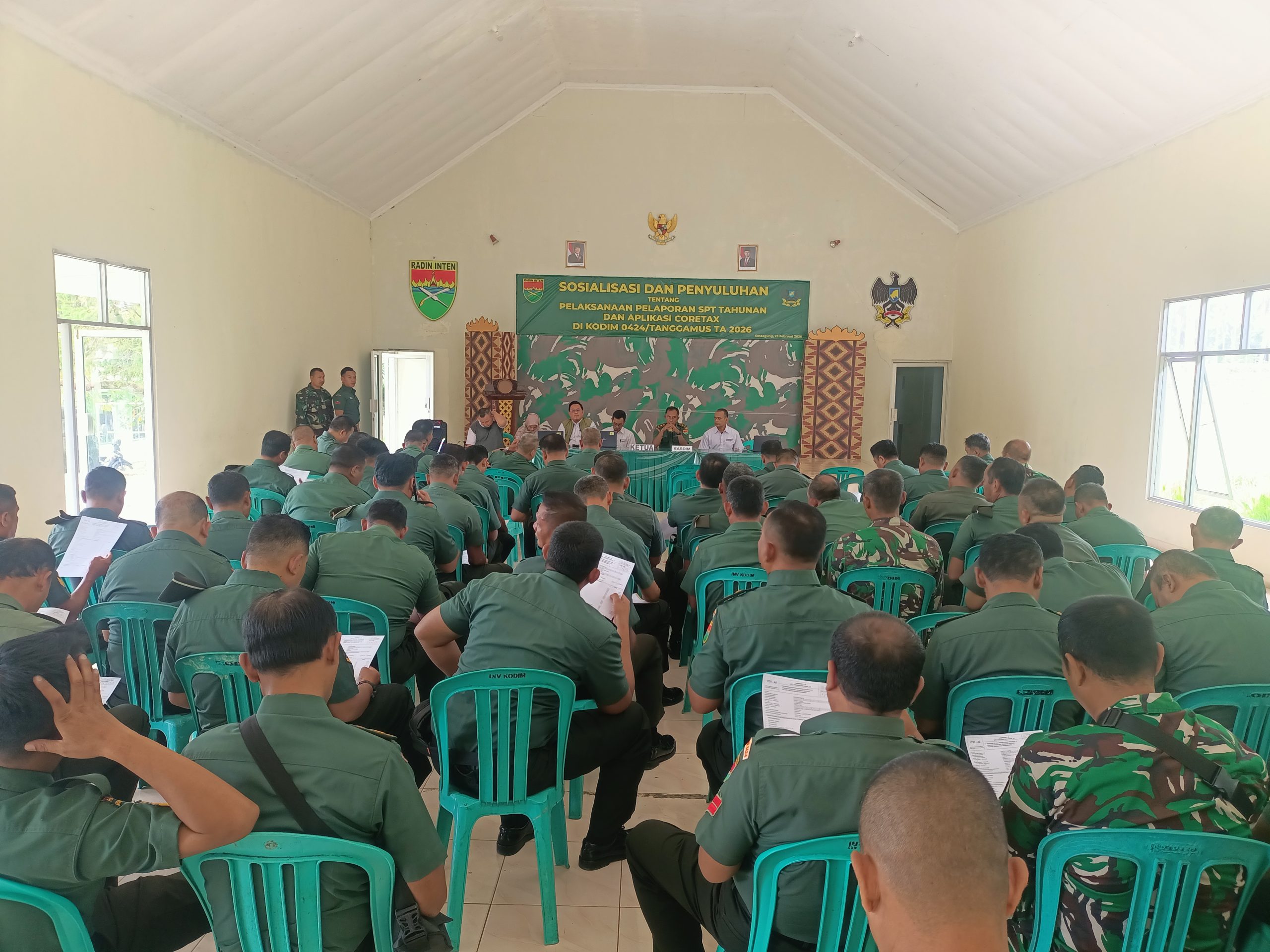 Tanggamus – Personel Kodim 0424/Tanggamus menerima sosialisasi dan penyuluhan terkait pelaksanaan pelaporan Surat Pemberitahuan (SPT) Tahunan serta penggunaan aplikasi Coretax yang dilaksanakan di Aula Jenderal Sudirman Makodim 0424/Tanggamus, Senin (23/02/2026).