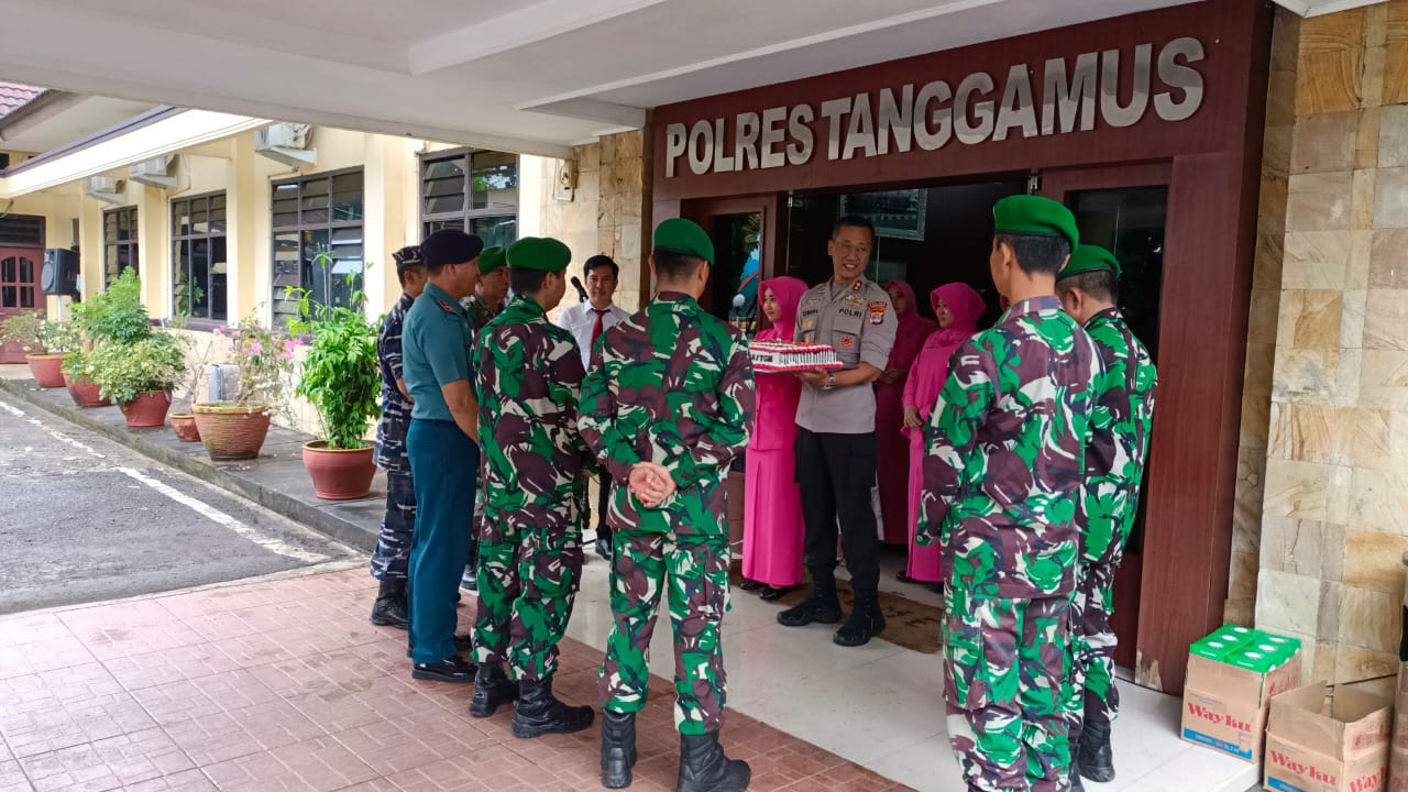 Personil Kodim 0424/Tanggamus Sambangi Mapolres Dengan Membawa Kue Ulang Tahun