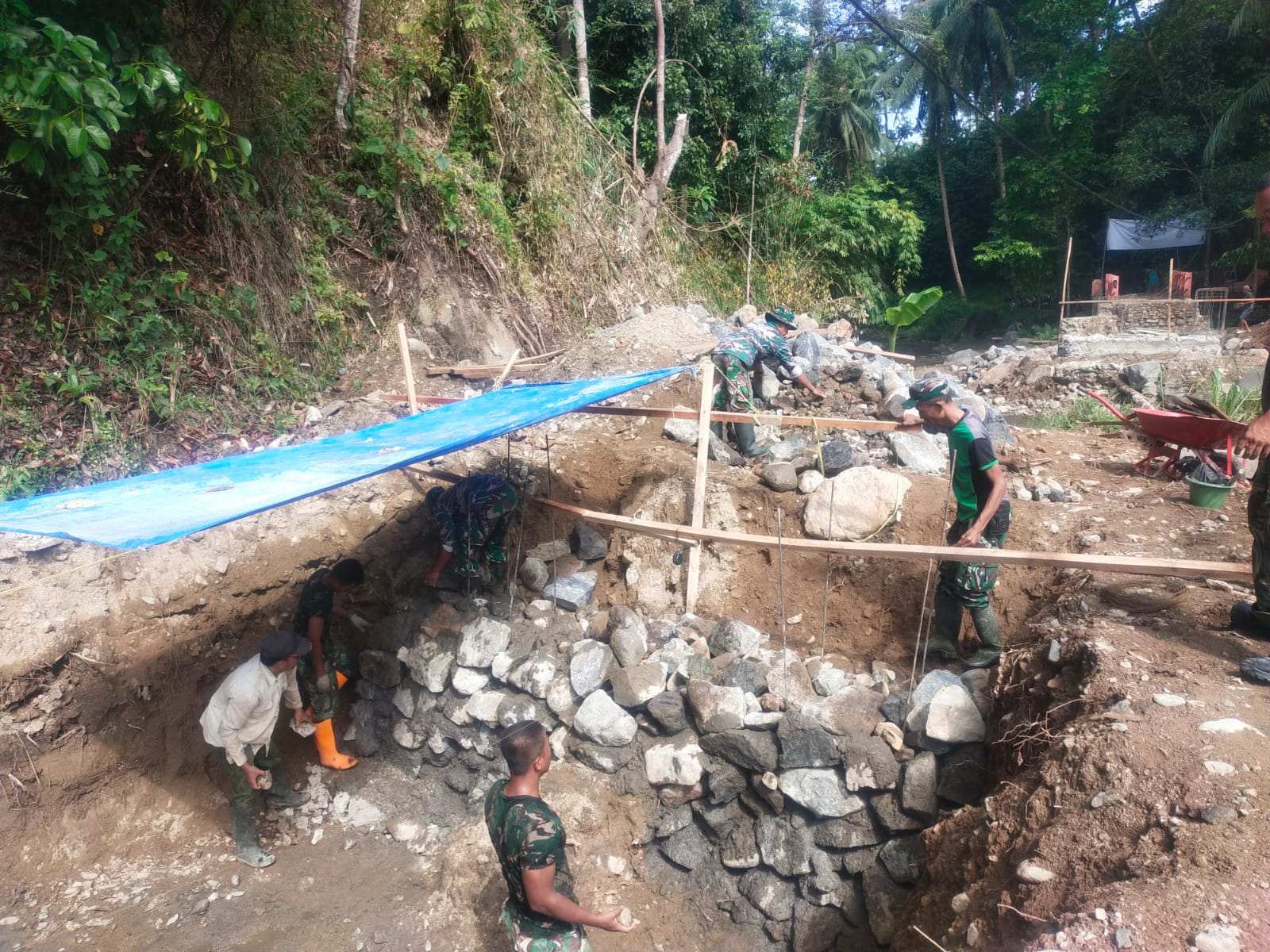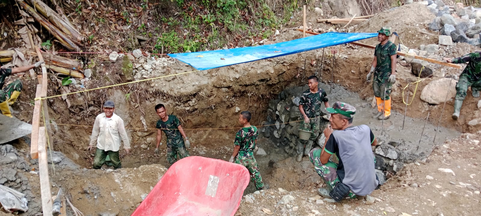 Prajurit TNI Bersama Warga Gotong Royong Cor Pondasi Jembatan Perintis Garuda Tahap III