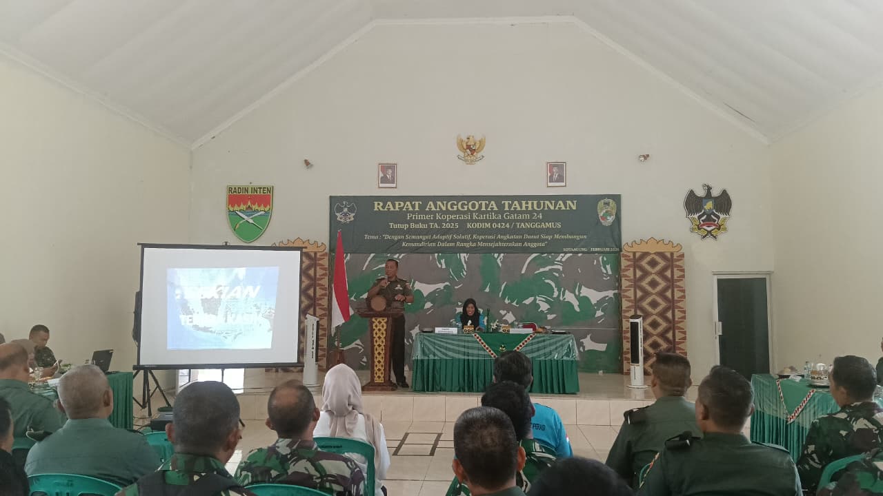 Tanggamus – Primer Koperasi Kartika Gatam 24 Kodim 0424/Tanggamus menggelar Rapat Anggota Tahunan (RAT) Tutup Buku Tahun 2025 pada Rabu (18/02/2026). di Aula Jenderal Sudirman Makodim 0424/Tanggamus.