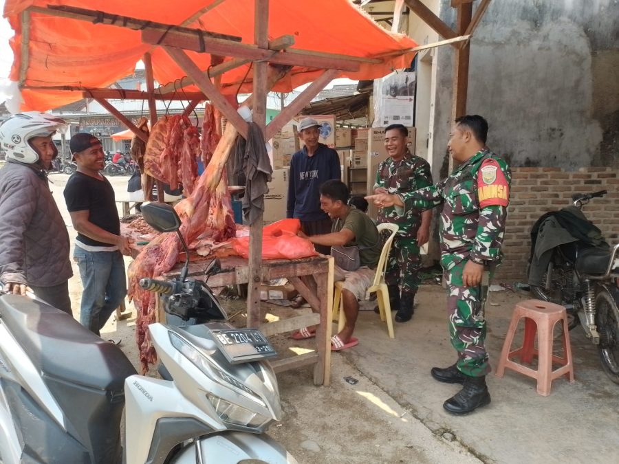 Babinsa Koramil 424-10/Pardasuka Peltu Khoirunsyah dan Sertu Martoyo mengecek harga daging sapi menjelang hari raya Idul Fitri 1444 H, di pasar tradisional, yang berlokasi di Pasar Pardasuka Kec. Pardasuka Kab. Pringsewu Kamis (20/04/2023).