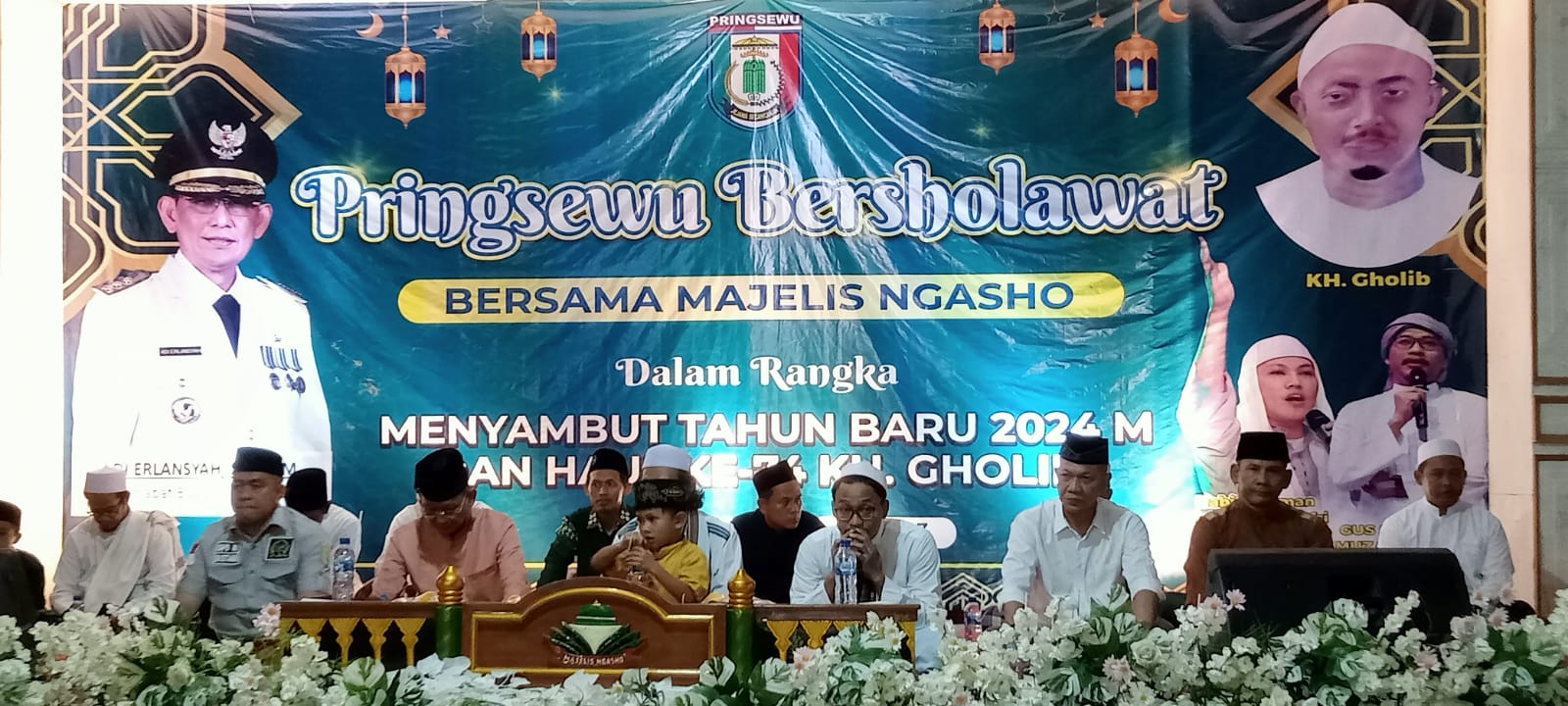 Pabung Kodim 0424/Tanggamus Mayor Cpl Sarwan Iranu mengikuti kegiatan Pringsewu bersholawat dalam rangka memperingati Hari ulang tahun Ke-74 KH Gholib dan menyambut tahun baru 2024 bertempat di pendopo Pringsewu, Jum’at (29/12/2023).