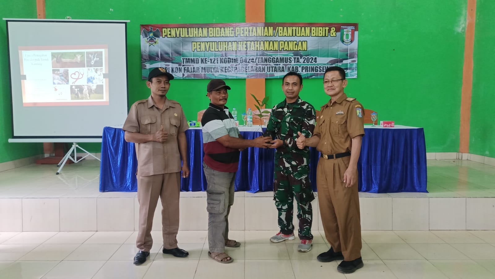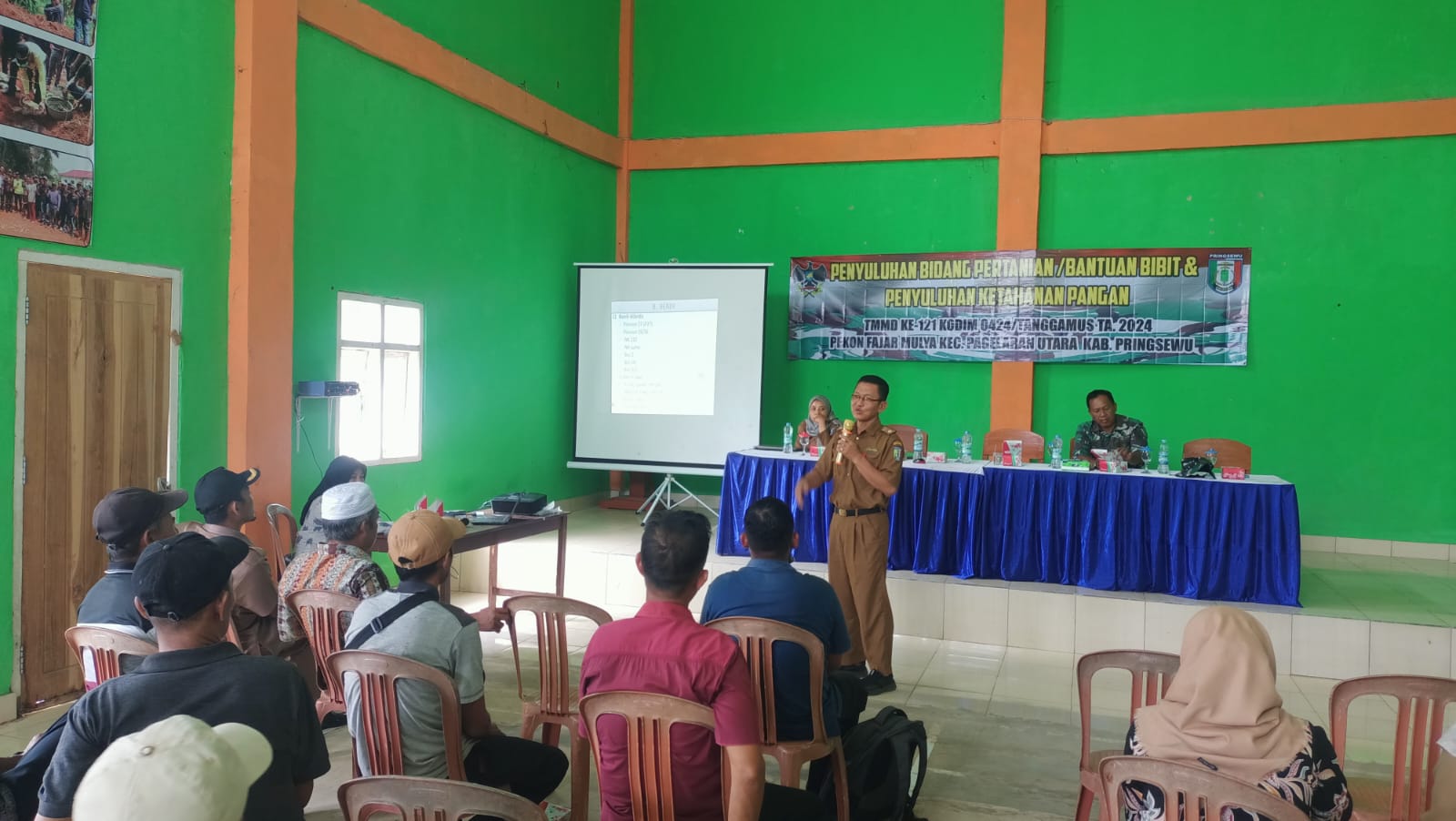 Satuan tugas TNI Manunggal Membangun Desa (TMMD) yang ke-121 Kodim 0424/Tanggamus mengandeng Dinas Pertanian dan Perkebunan Kab. Pringsewu melaksanakan sasaran non fisik dengan menggelar penyuluhan pertanian serta pemberian bibit kepada kelompok tani yang dilaksanakan di Aula Pekon Fajar Mulya Kec. Pagelaran Utara. Selasa (06/08/2024).