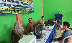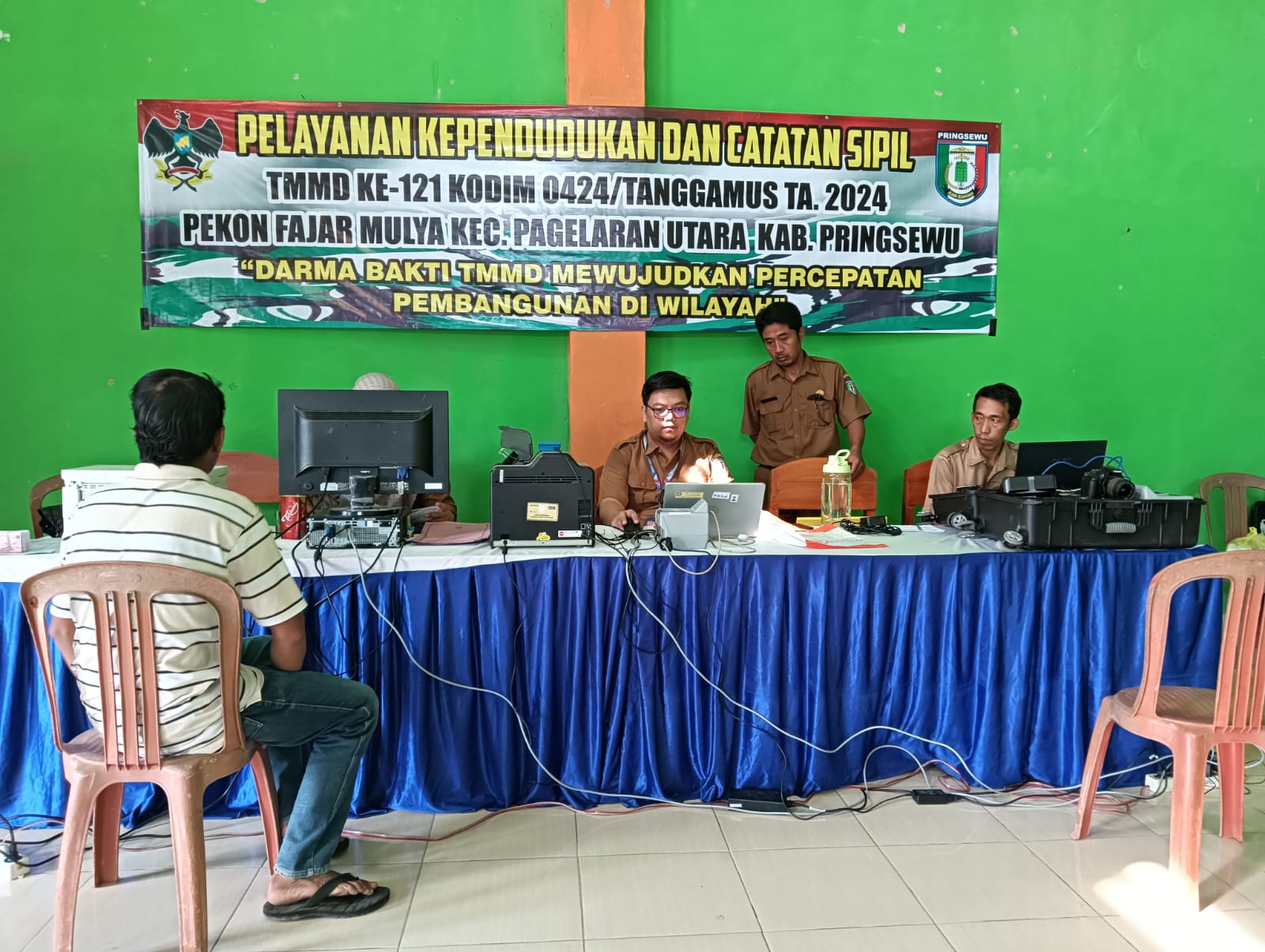 Satgas TNI Manunggal Membangun Desa (TMMD) ke 121 Kodim 0424/Tanggamus bekerjasama dengan Dinas Kepedudukan serta Catatan Sipil Kab. Pingsewu menggelar Pelayanan Administrasi Kependudukan gratis kepada warga di Pekon Fajar Mulya Kec. Pagelaran Utara Kab. Pringsewu. Senin (29/7/24).
