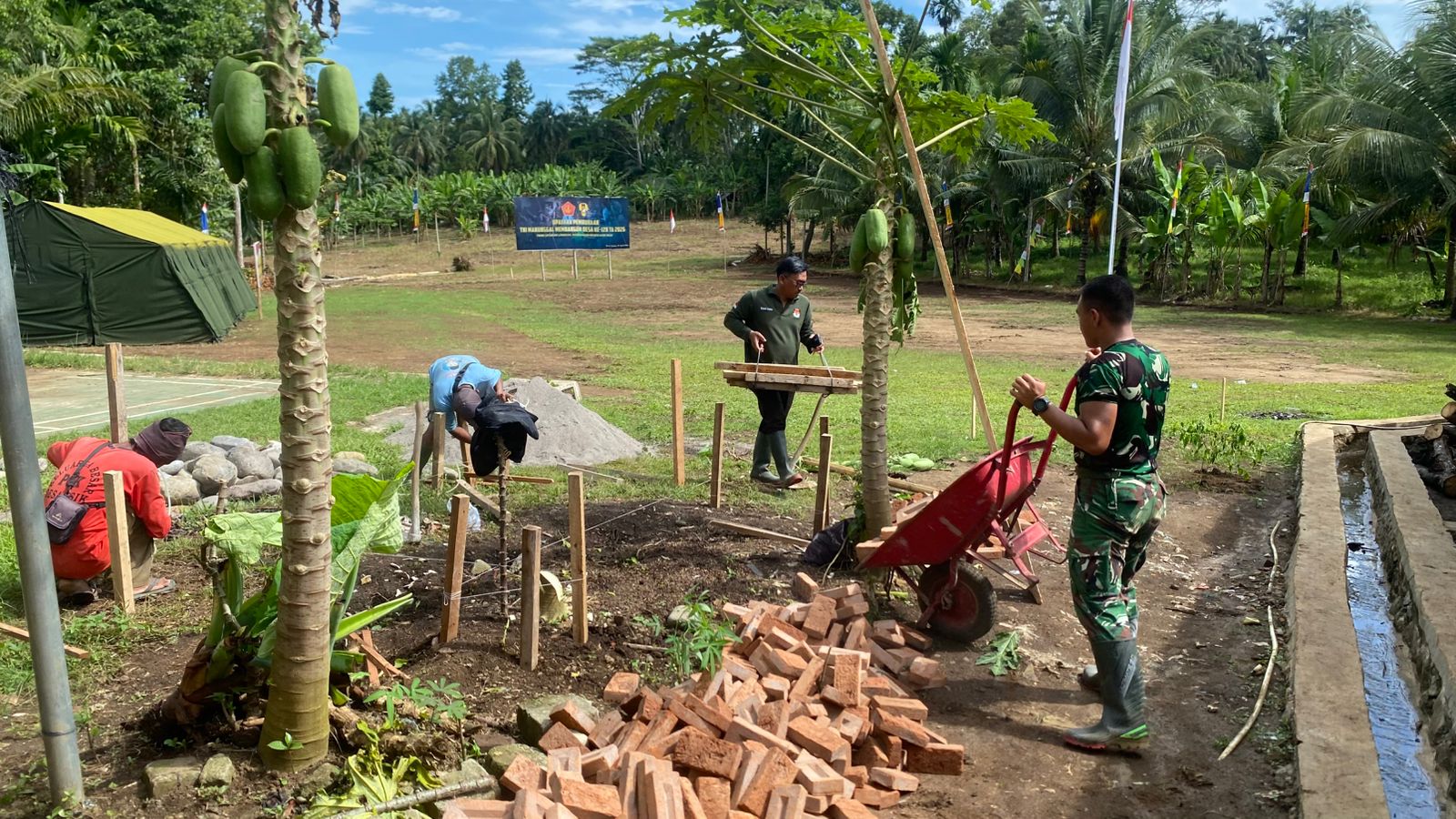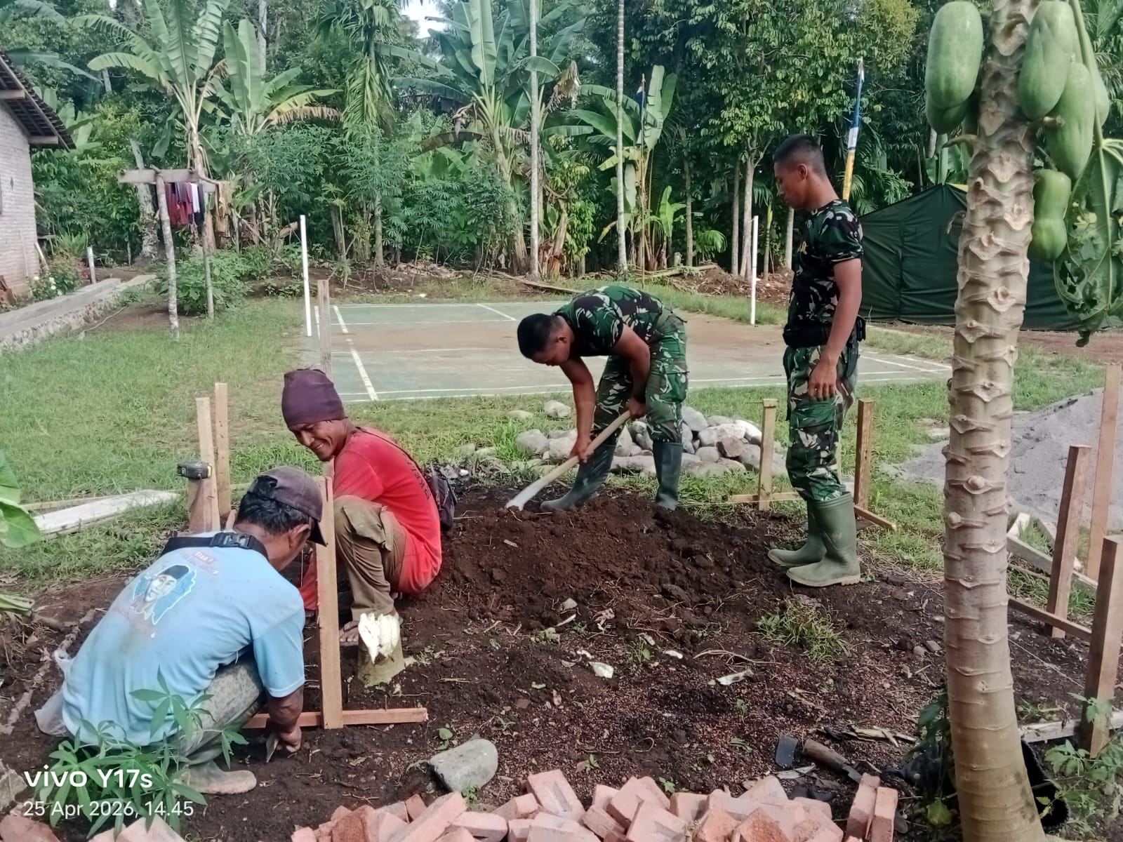 Saat ini, proses pengerjaan telah berjalan dengan melibatkan personel Satgas TMMD bersama masyarakat setempat, dimulai dari pengumpulan material seperti bata, pasir, batu, kayu, hingga semen. Selain itu, juga dilakukan penggalian tanah untuk pembuatan septic tank sebagai bagian dari fasilitas sanitasi.