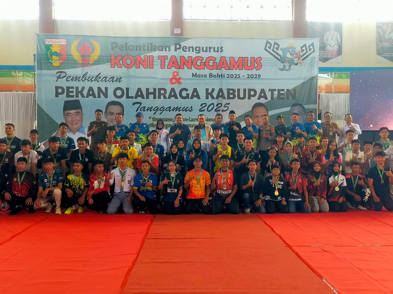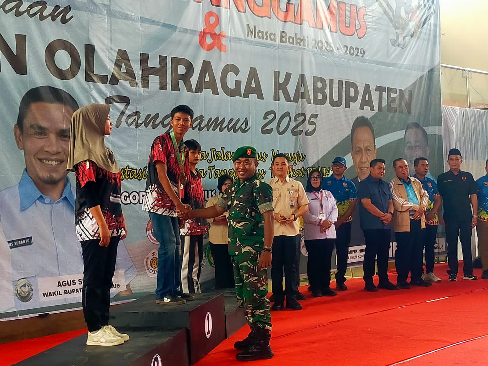 Tanggamus – Serka M. Iqbal mewakili Dandim 0424/Tanggamus Letkol Inf Dwi Djunaidi Mulyono, S.E., M.I.P., menghadiri kegiatan Penutupan Pekan Olahraga Kabupaten (POPKAB) Tanggamus Tahun 2025 yang berlangsung di GOR Tanggamus, Way Som Pekon Kota Agung, Kecamatan Kota Agung Pusat, Kabupaten Tanggamus, Senin (24/11/2025).