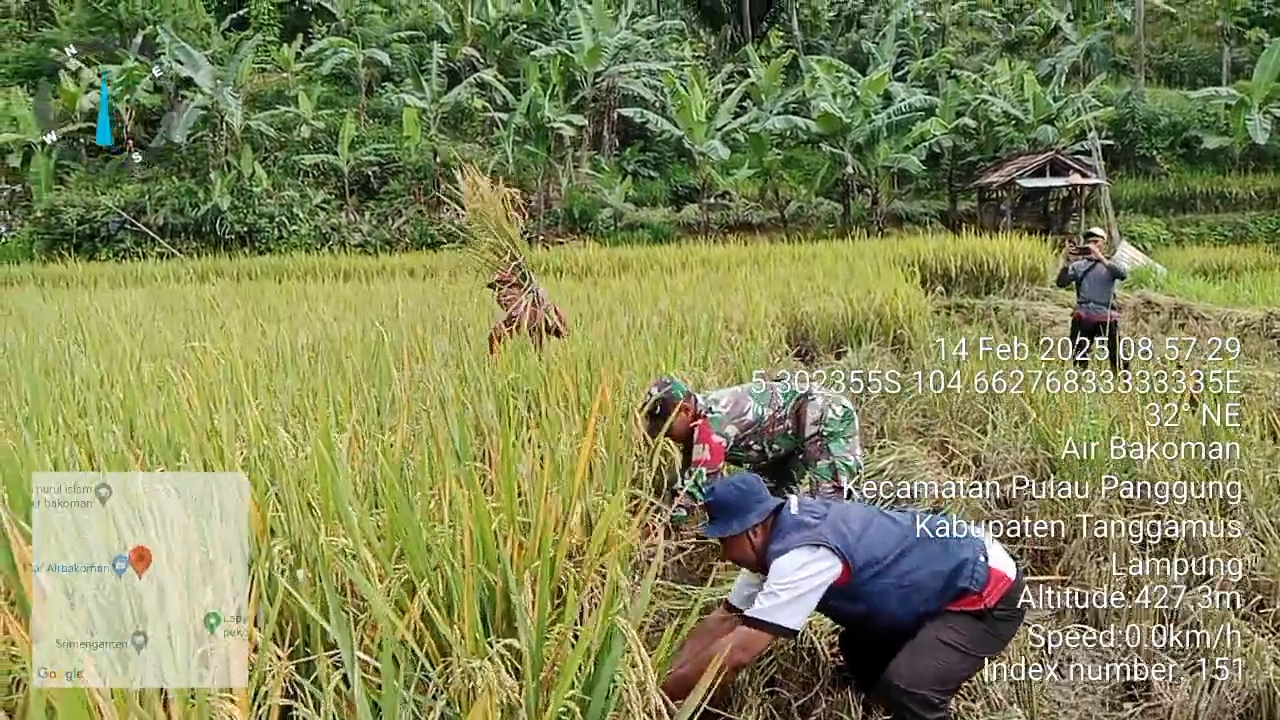 Babinsa Koramil 424 – 08/ Pulau Panggung, Serda M Rahmad melaksanakan pendampingan kepada petani saat memanen padi di Pekon Air Bakoman, Kec. Pulau Panggung, Kab. Tanggamus. Sabtu (15/02/2025).