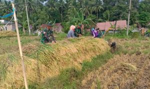 Wujud dukungan TNI khususnya prajurit kewilayahan yaitu Babinsa dalam mendukung ketahanan pangan, dengan Semangat ikut serta terjun langsung ke sawah bantu para petani desa binaannya saat memanen padi, inilah yang dilakukan oleh Babinsa kepada para petani warga desa binaannya.
