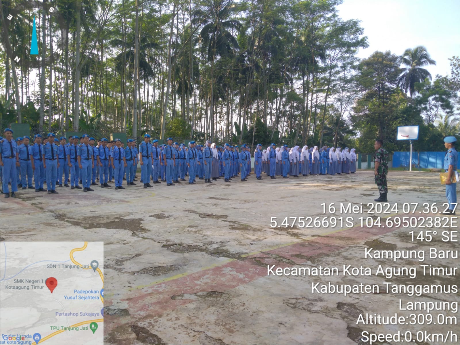 Babinsa Koramil 424-03/Kota Agung ,Sertu Agung Pribadi, memberikan pelatihan dasar Peraturan Baris Berbaris (PBB) kepada siswa dan siswi SMKN 1 kota Agung Timur, Kec. Kota Agung, Kab. Tanggamus. Kamis (16/05/2024).